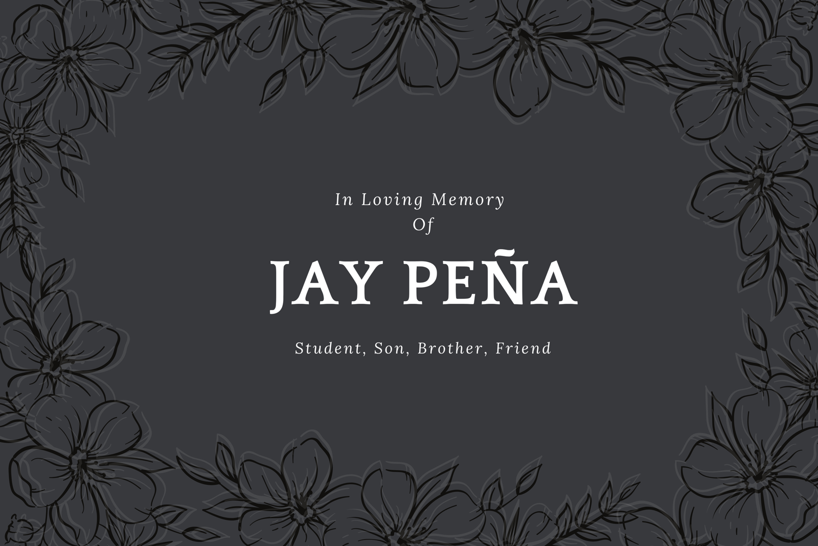 Our hearts are broken as we mourn the loss of Jay Pena, whose life was taken far too soon. He was a son, a brother, a friend, and a protector who cared deeply for the people around him.