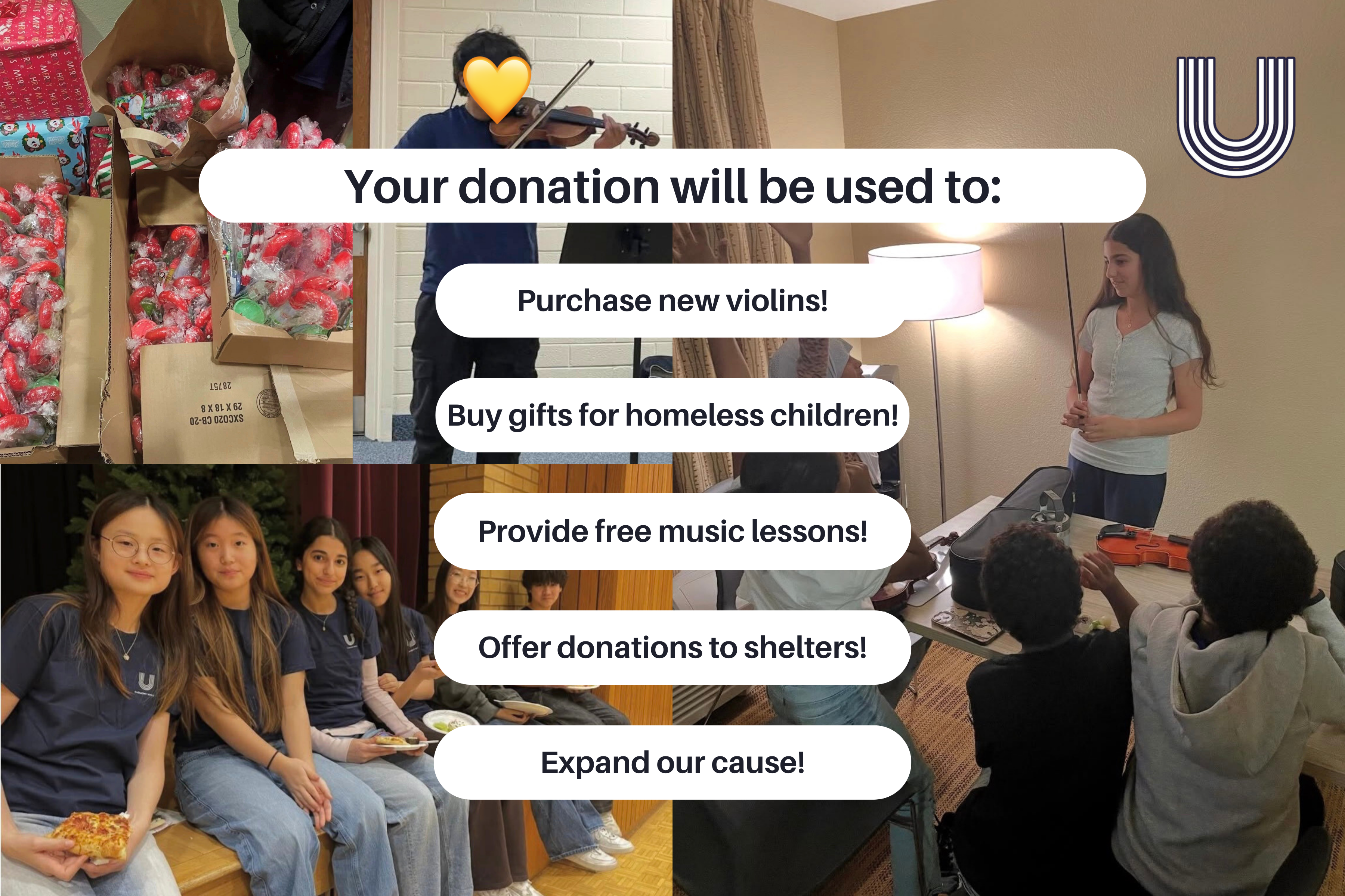 Through free violin lessons and community events at shelters, we provide creative outlets, support, and resources to disadvantaged youth. To date, we have reached hundreds of children across Virginia, Maryland and DC and raised over $5,000 to support these efforts.