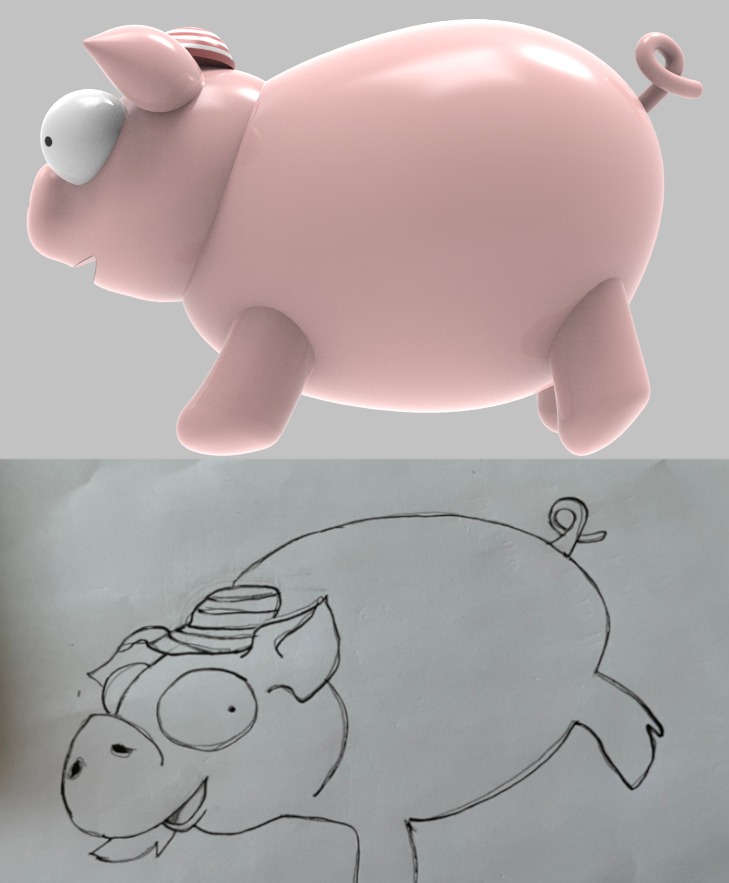 spread askew distort giant pig's face so its cartoon smile is grotesque