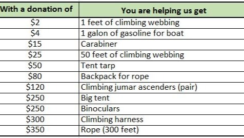 Today, as we prepare for the new season, we are still recovering from the boat accident and trying to restock our climbing equipment and other gear. We still have some old gear to start the season, but it needs to be replaced ASAP.