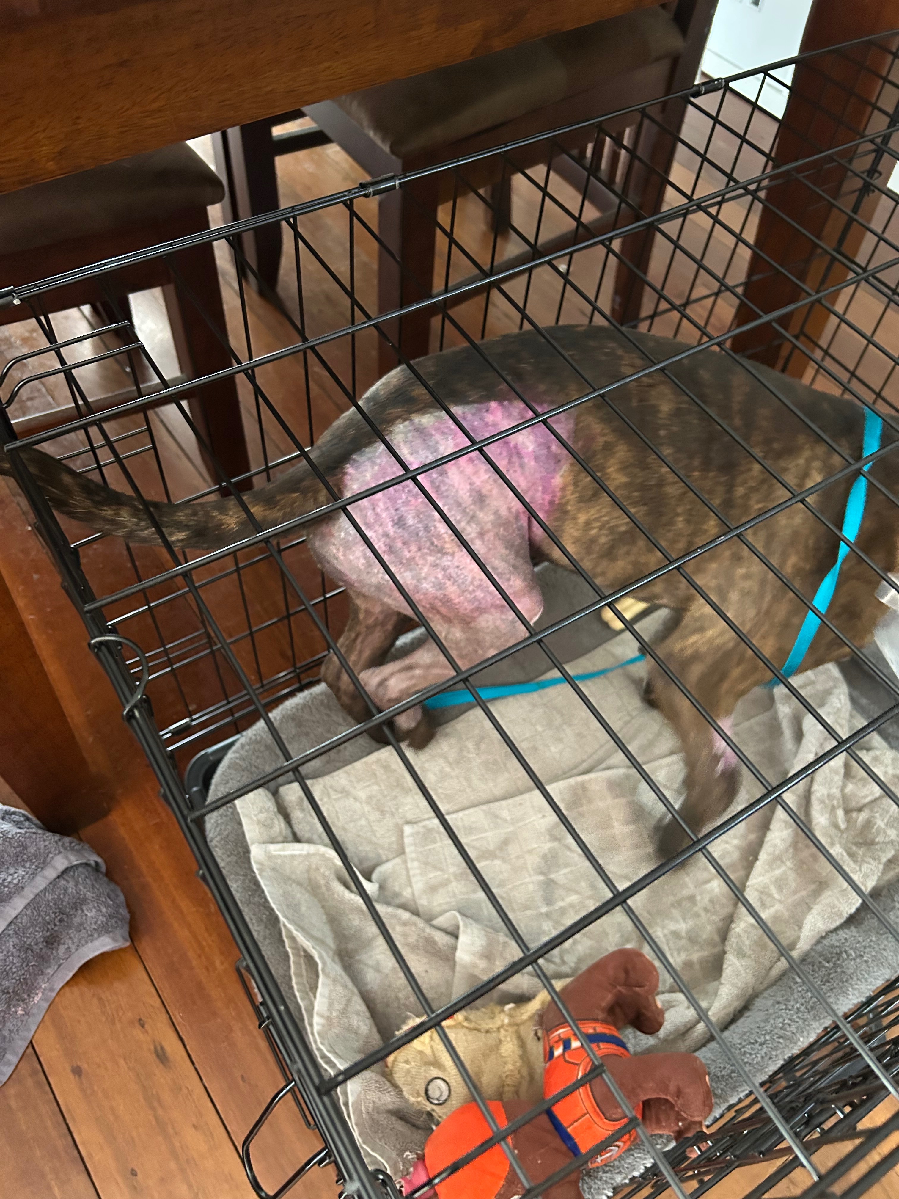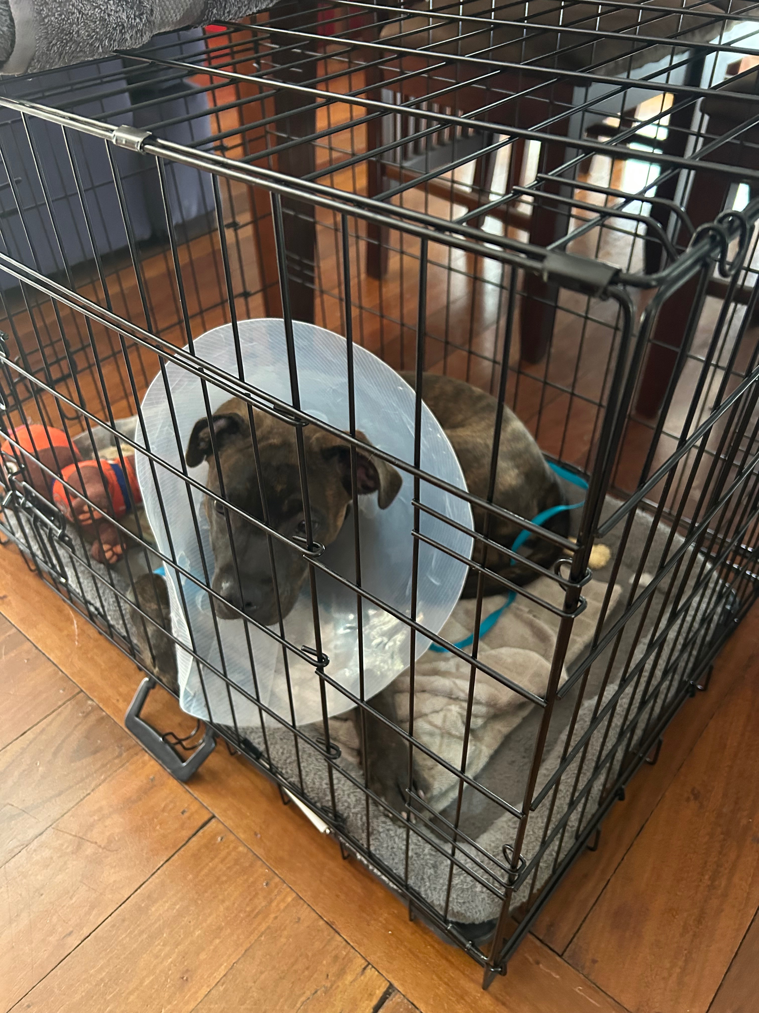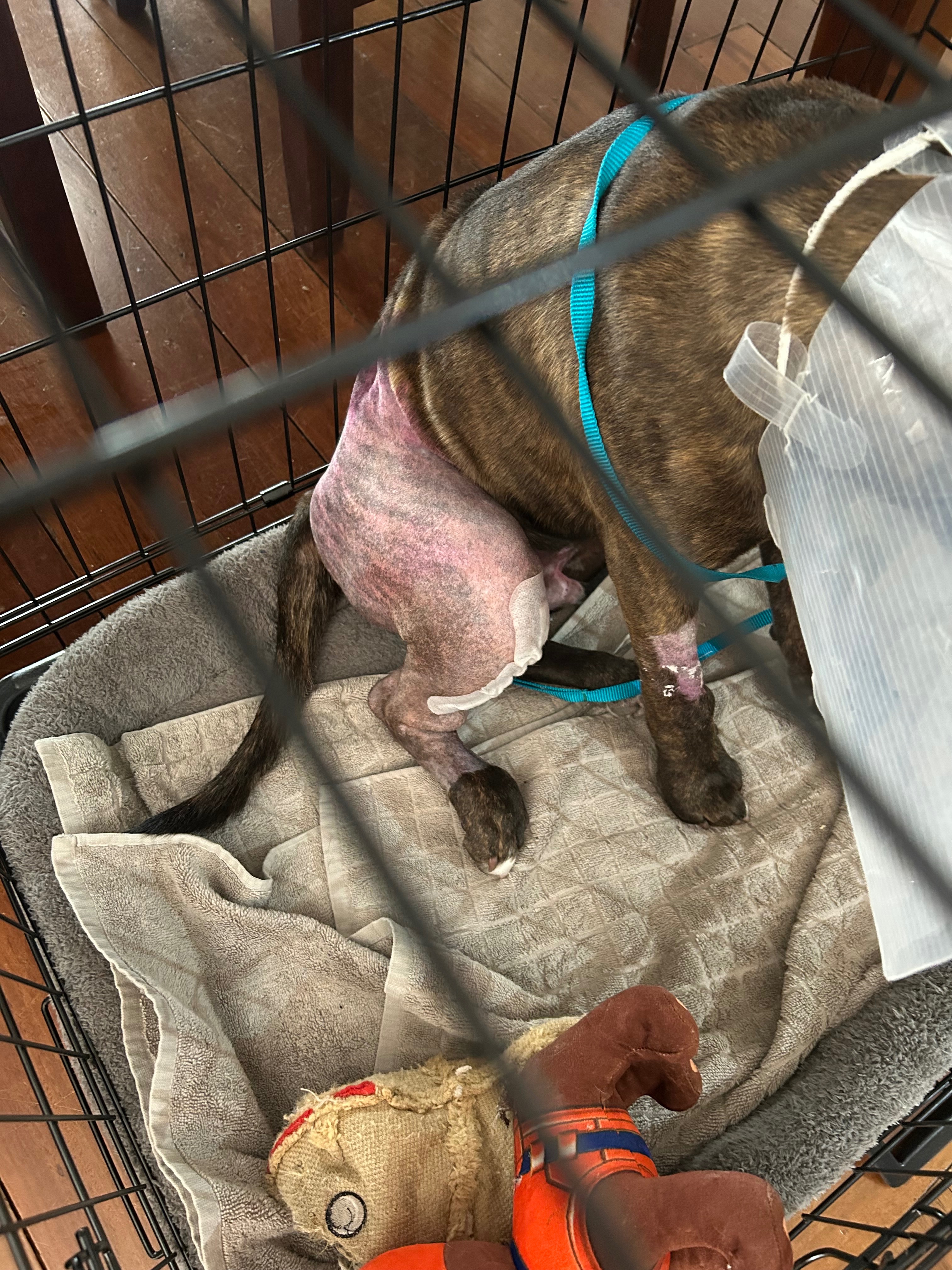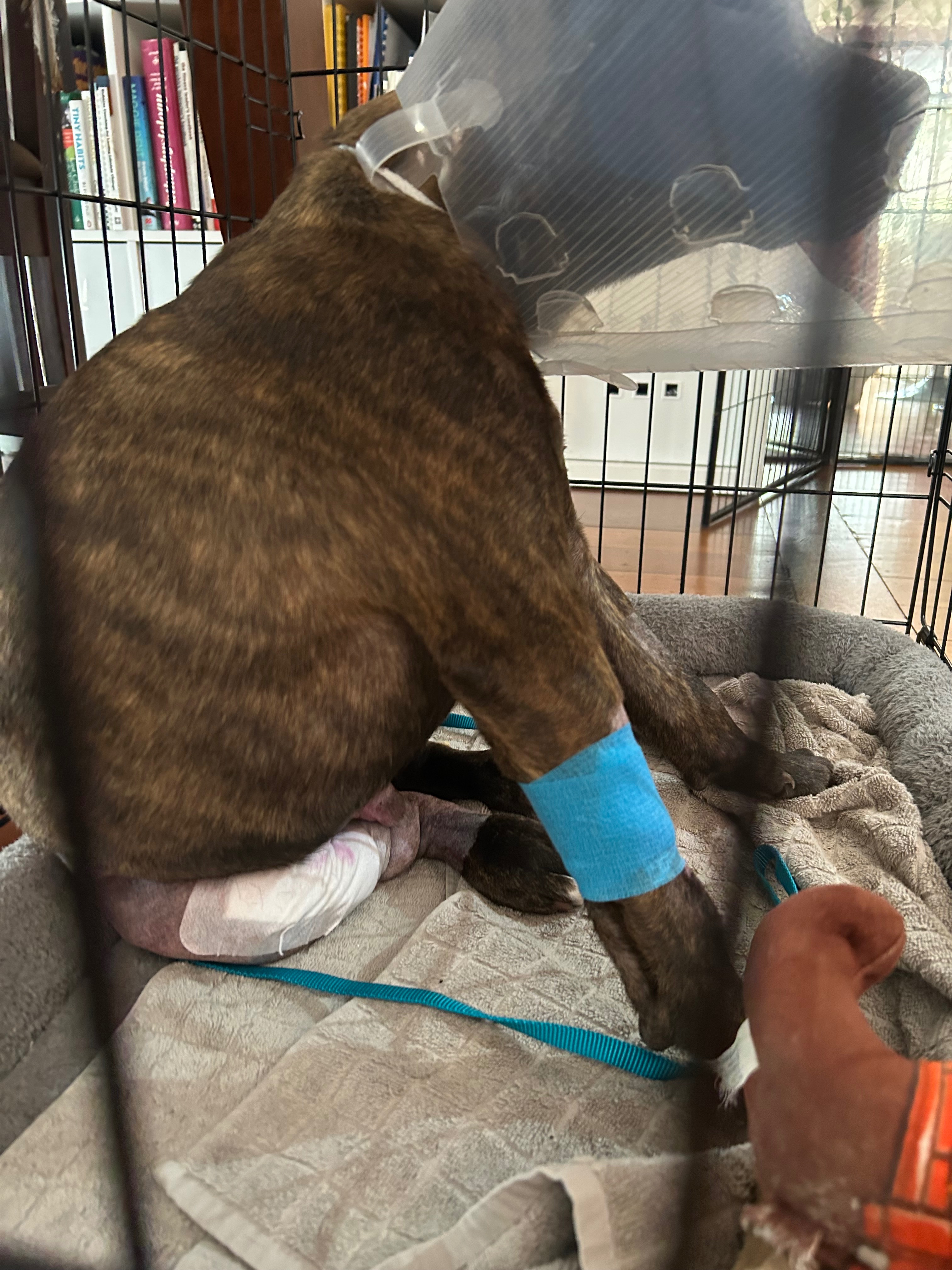 Gus now faces the hardest part of recovery — six weeks of strict crate confinement while the bone and growth plate heal.