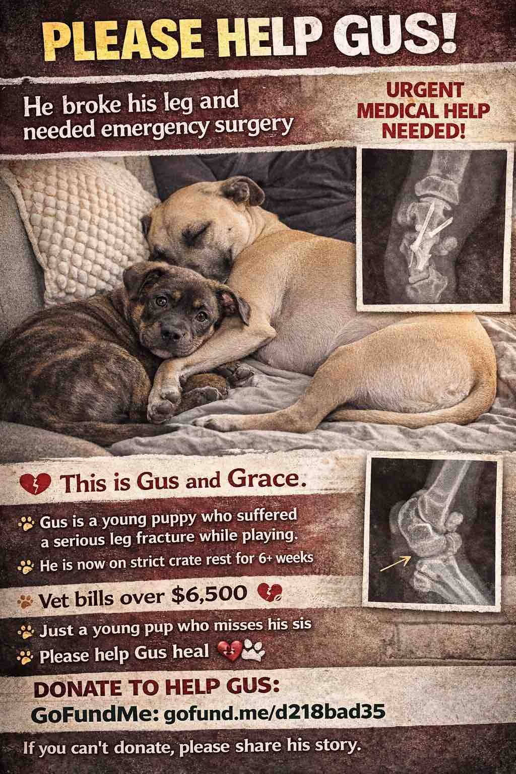 If you are able to contribute even a small amount toward Gus’s recovery, it would mean the world to us. Every donation will go directly toward his veterinary costs and rehabilitation.