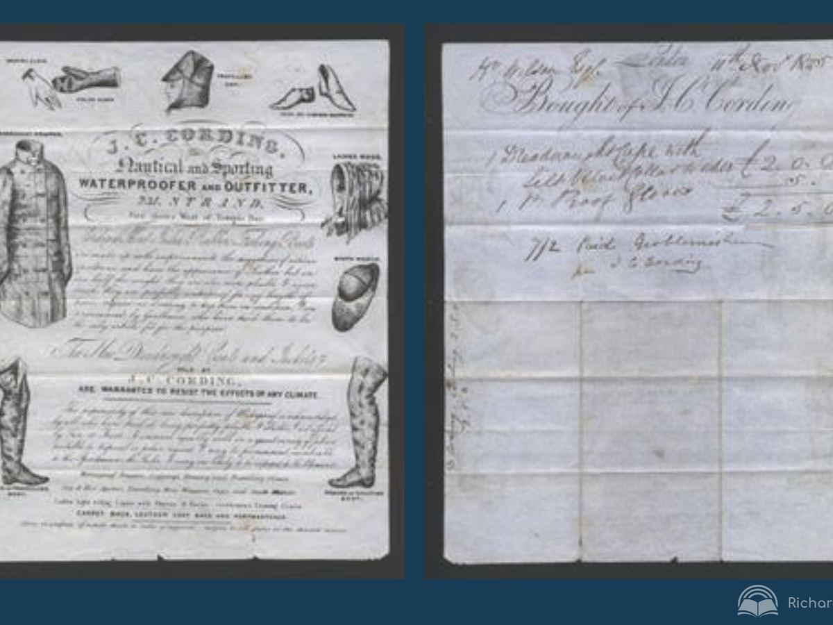 Innovative Product: The advert promotes waterproof outdoor clothing, a novelty in that era. The technique used was ‘vulcanising’ the cloth, which made it more effective than existing waterproof solutions. Today, we would call such a coat a ‘mac’.