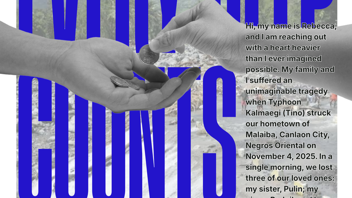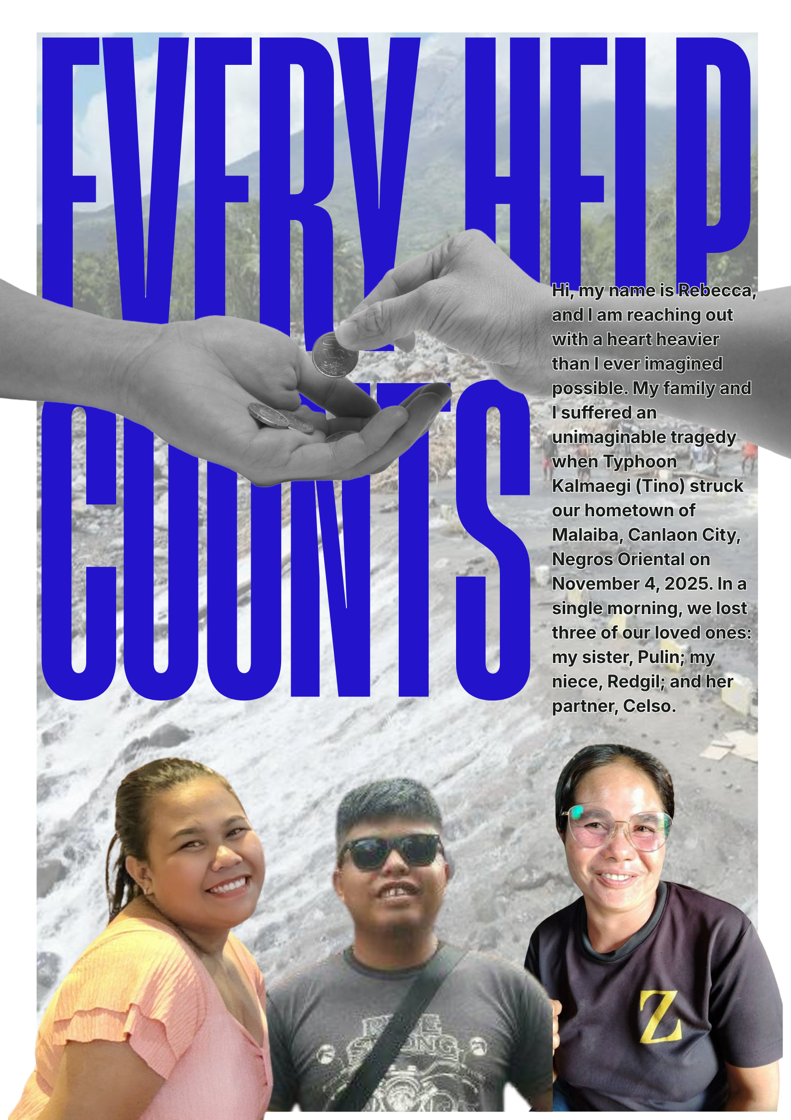 Hi, my name is Rebecca, and I am reaching out with a heart heavier than I ever imagined possible. My family and I suffered an unimaginable tragedy when Typhoon Kalmaegi (Tino) struck our hometown of Malaiba, Canlaon City, Negros Oriental on November 4, 2025. In a single morning, we lost three of our loved ones: my sister, Pulin; my niece, Redgil; and her partner, Celso.