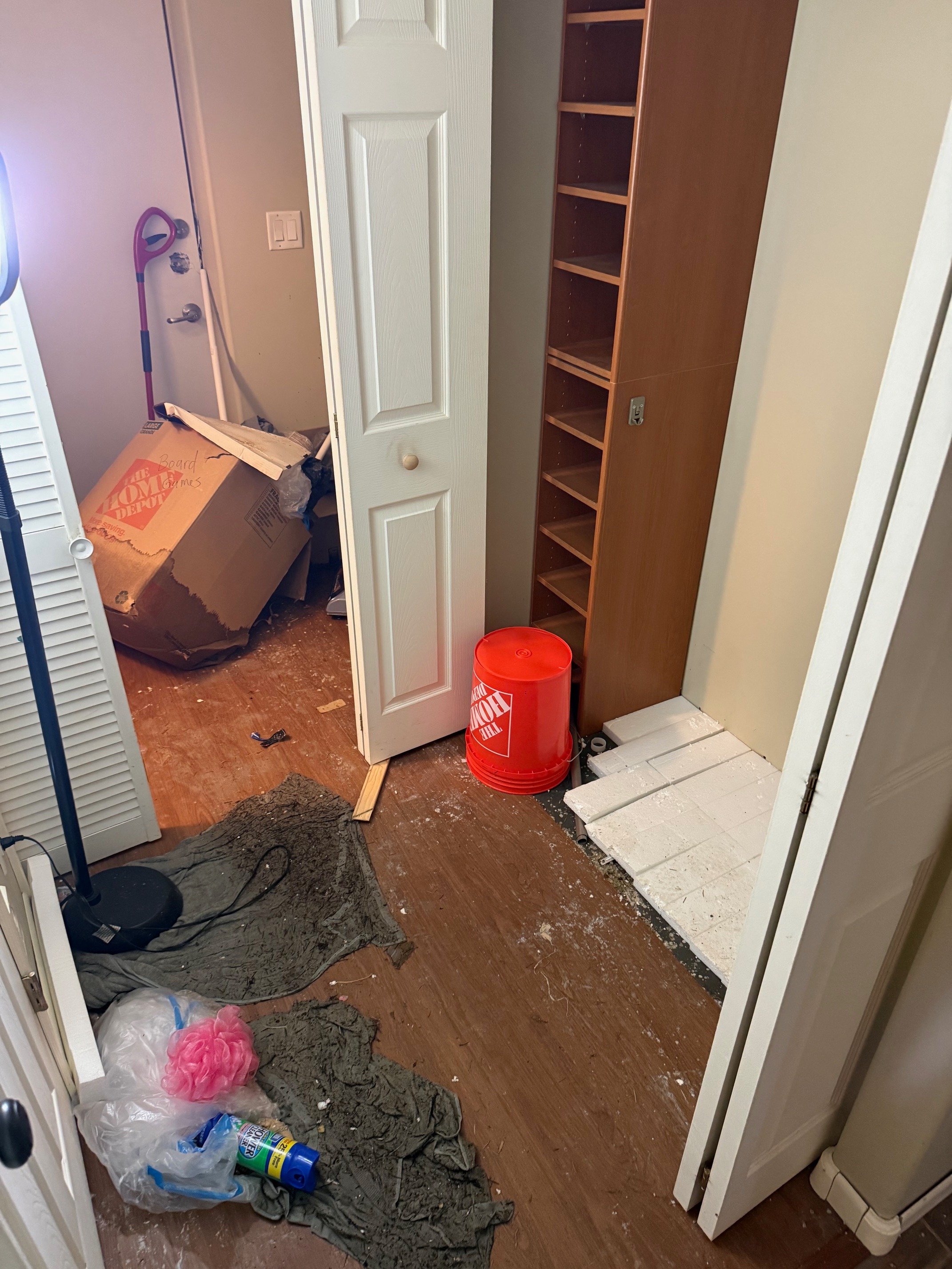We've already spent so much on plumbers, a pack out team to remove our items that survived and trash what did not, and hiring a specialty demolition company. The last one is most important because they are making sure the water and moisture is removed and the house is treated to remove mold and mildew. The extent of the damage was huge. We had to tear up all flooring on the level, remove two feet of wall from the floors, and demolish a bathtub. This level had a living room where we stored belongings and I used as a studio to edit and livestream, a guest room where our nephew sometimes stays with us, a bathroom, a laundry room, and an HVAC and closets.