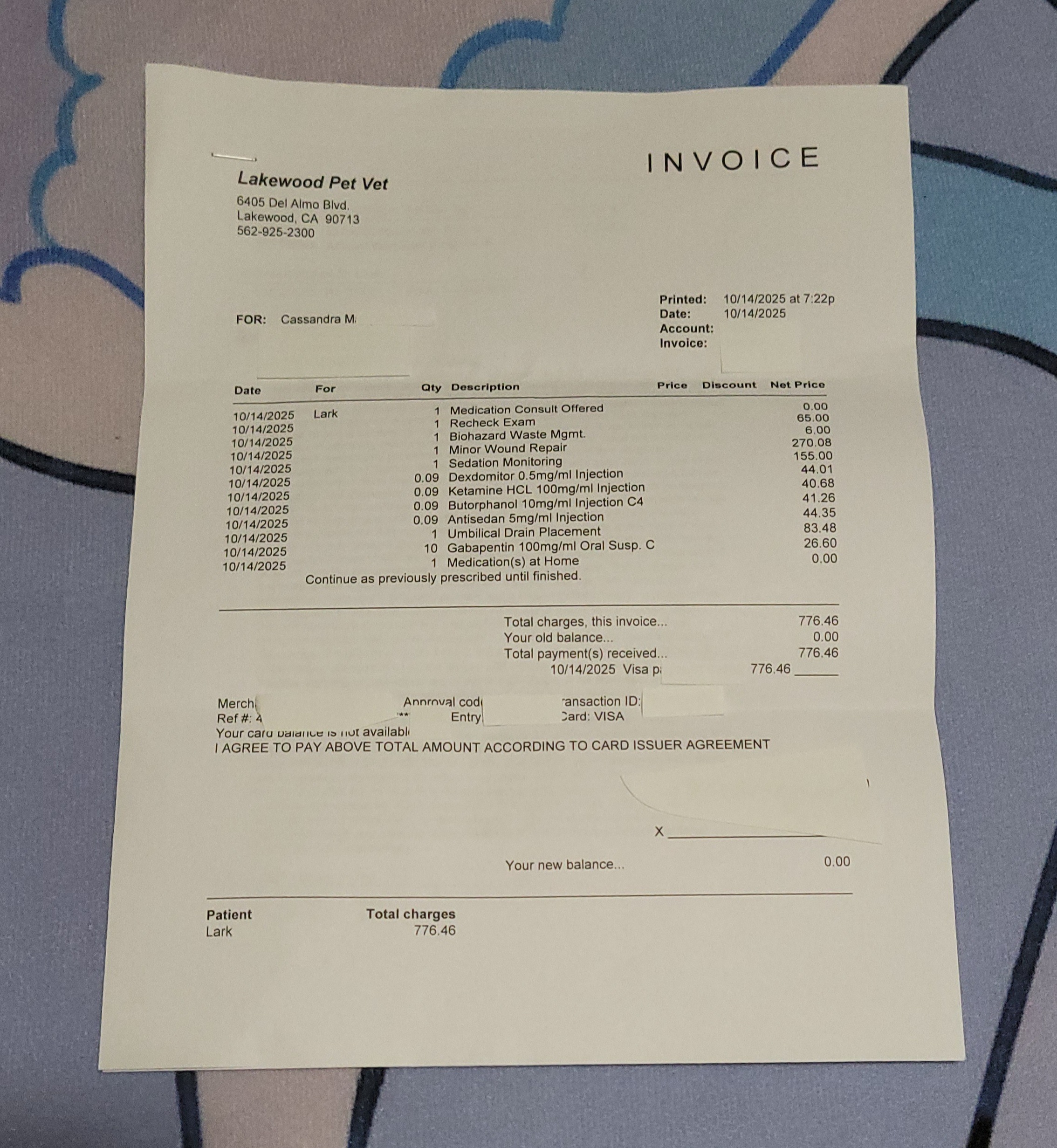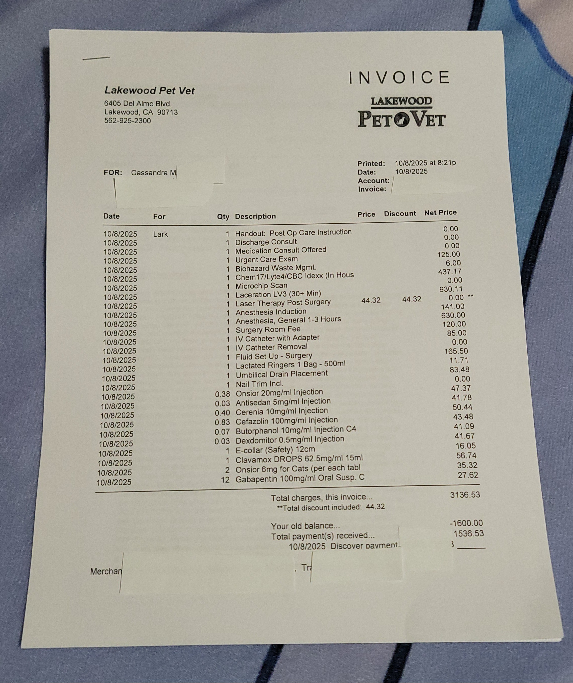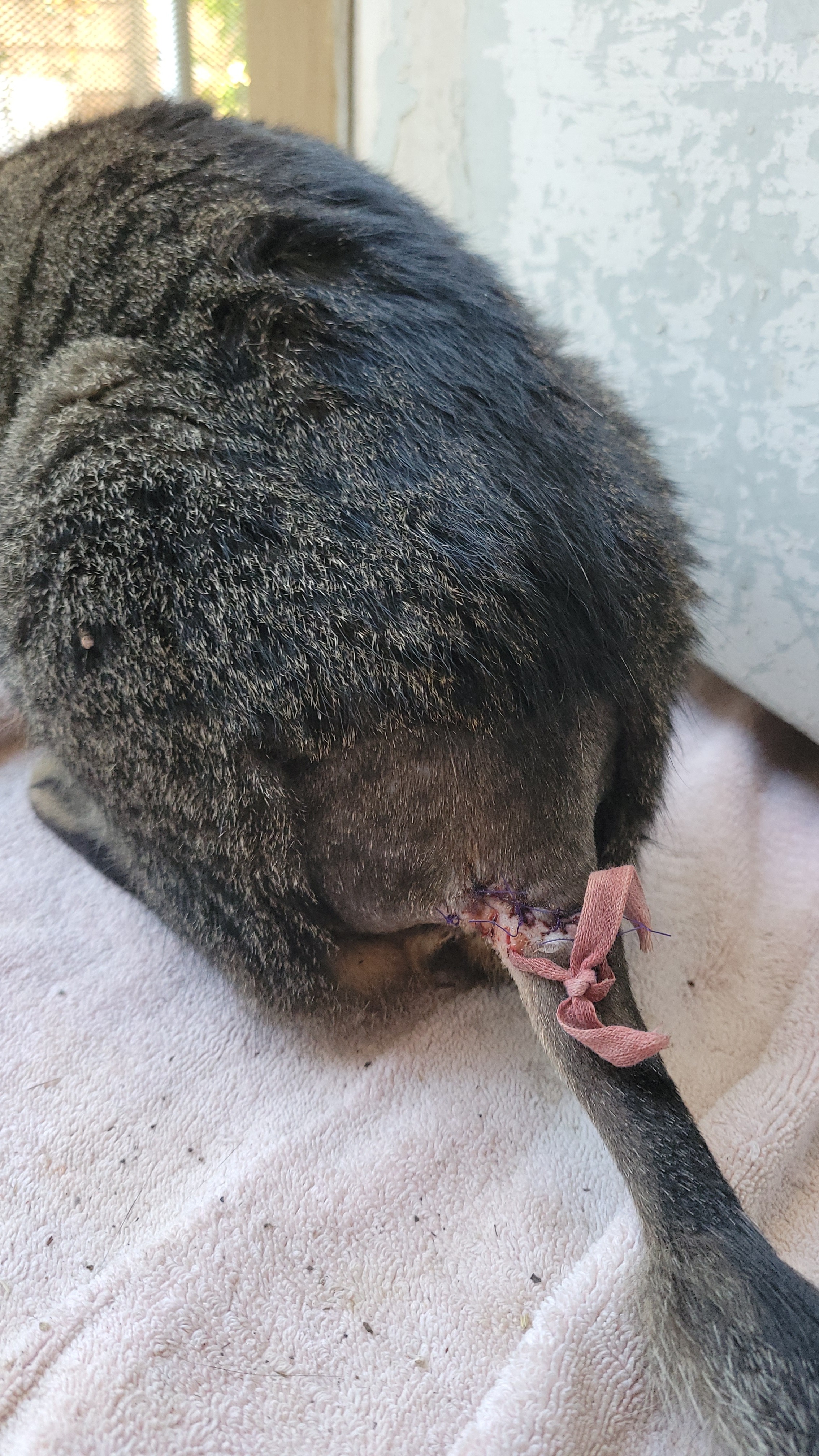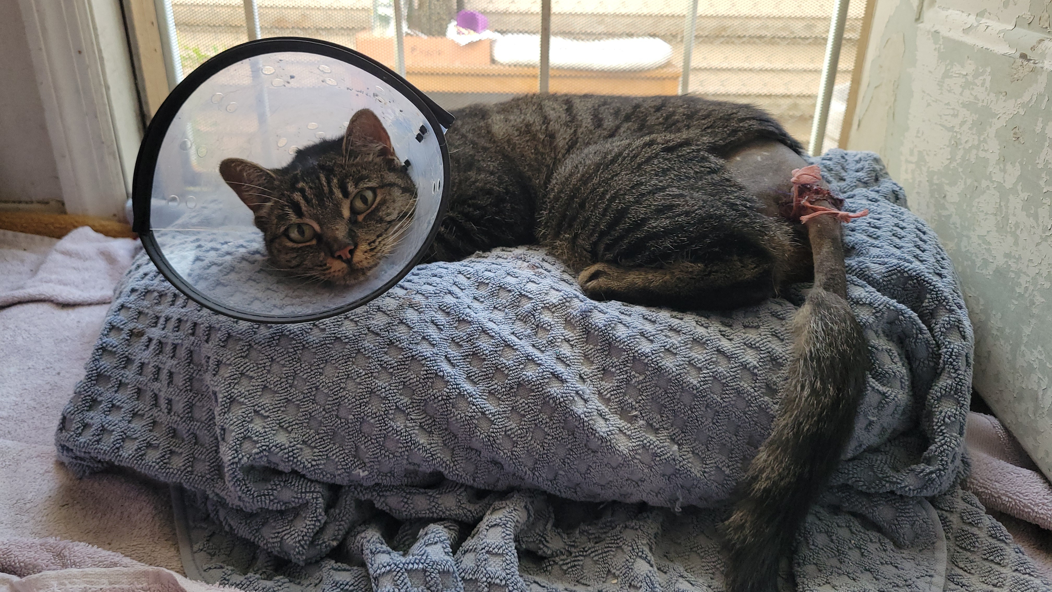 On 10/08, coming home from work, she came up to me with a very deep wound around the base of her tail, skin missing around a quarter in size, muscle & bone exposed at some angles. It seemed fresh & she was intent on licking it. After I went inside to get a cage, she ran off into a neighboring yard. I posted on Facebook in some local animal groups hoping for some guidance on financing for strays. This has been a particularly awful year for us as our pets have accumulated around $4065.63 in their own vet bills alone that we're working to pay back & we really could not take on this financial burden. At the same time, we couldn't in good conscience leave her to die. By the time I was able to get her an appointment at the closest vet to me, Lakewood Pet Vet, I was suggested some groups to look into as well as community fundraising. The latter seemed the better option at the time as we had already put her care on our credit. She was already showing signs of infection & needed care as soon as possible so there was not much time to make many calls.
