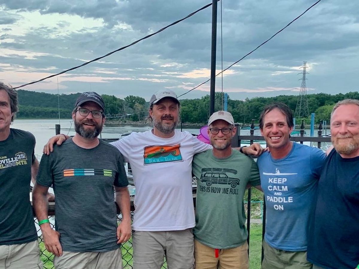 Our cover photo shows, from left to right, Support Crew Leader Mike “Moose” Dougherty, paddlers Judson, Scott, Paul and Wally and support crew member John Ackerman, on a training trip in the summer of 2022