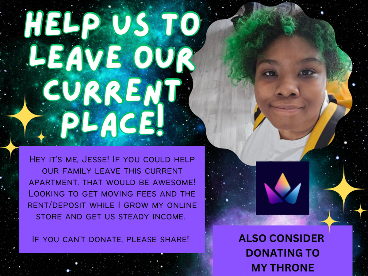 Hey it's me, Jesse! If you could help our family leave this current apartment, that would be awesome! Looking to get moving fees and the rent/deposit while I grow my online store  and get us steady income.