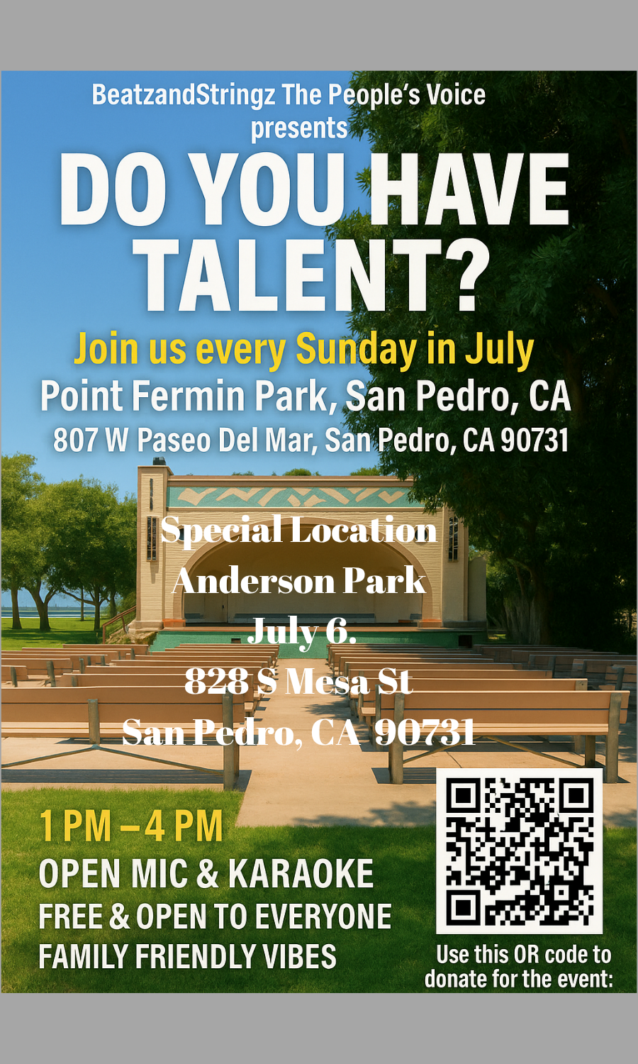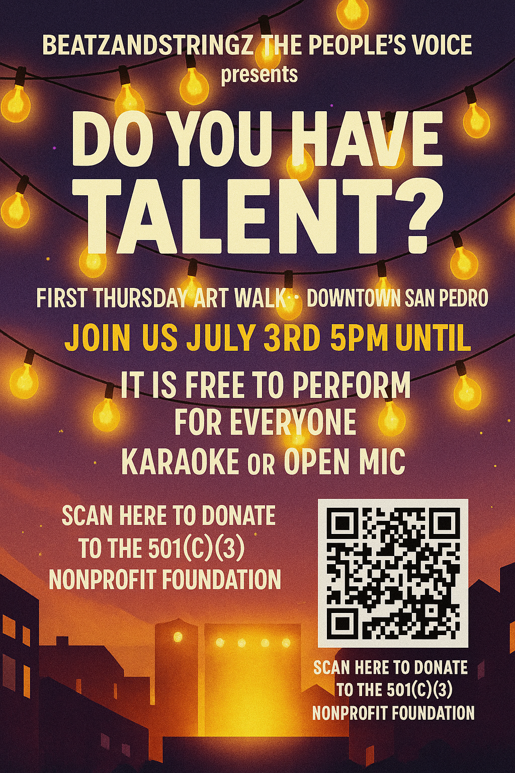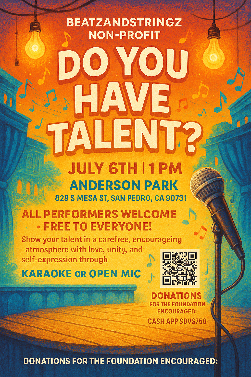 BeatzandStringz offers a stage—literally and figuratively—for individuals of all ages to share their stories, music, poetry, and talent. We never charge the community to participate. Everything we offer is powered by donations, love, and purpose.