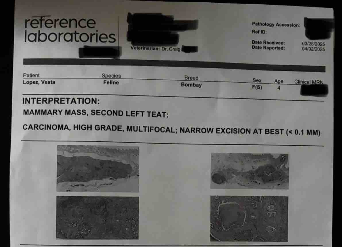 Things are not looking good for Vesta. They recently diagnosed her with grade 3 carcinoma mammary cancer.