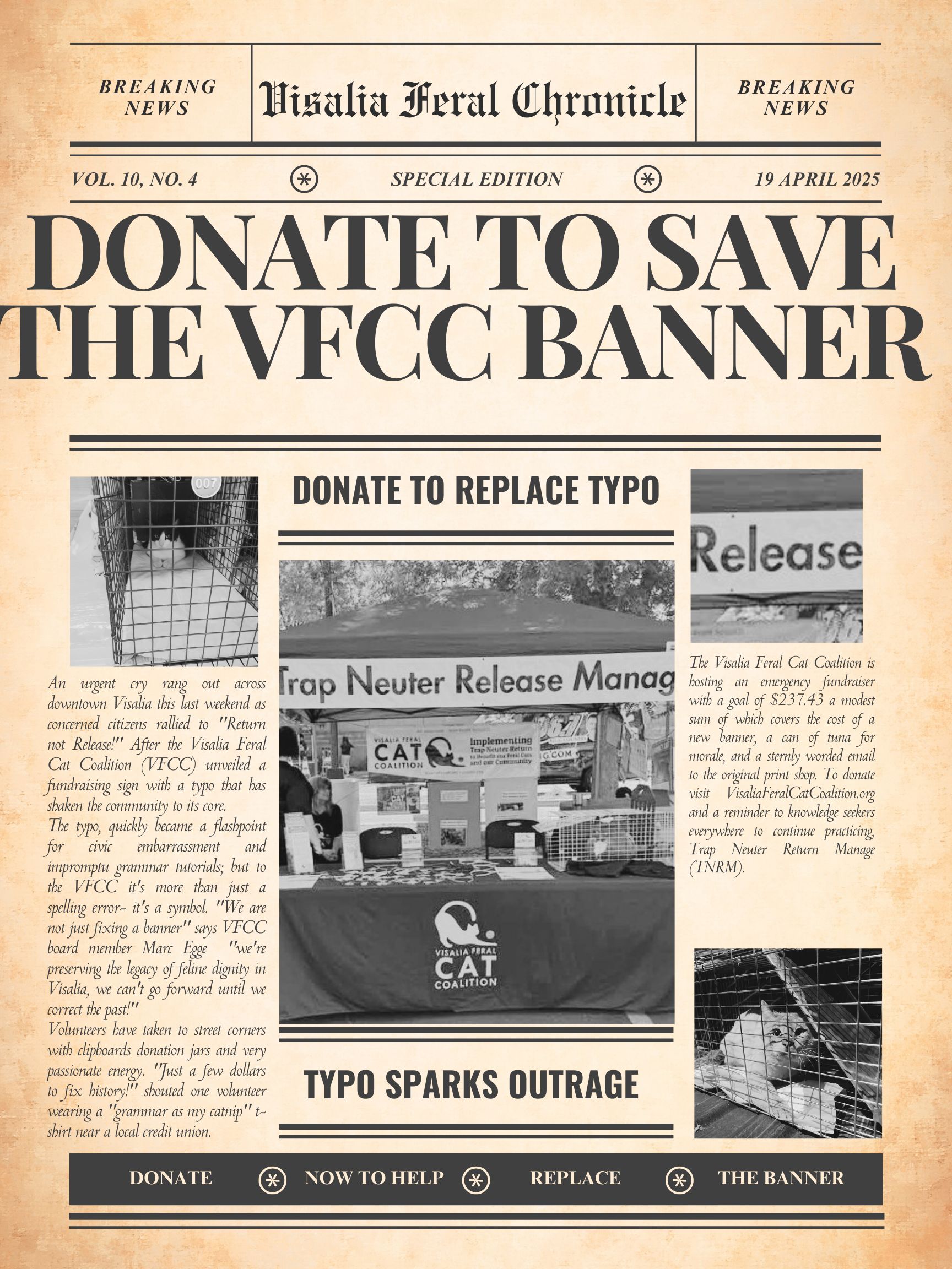 An urgent cry rang out across downtown Visalia this last weekend as concerned citizens rallied to "Return not Release!" After the Visalia Feral Cat Coalition (VFCC) unveiled a fundraising sign with a typo that has shaken the community to its core.