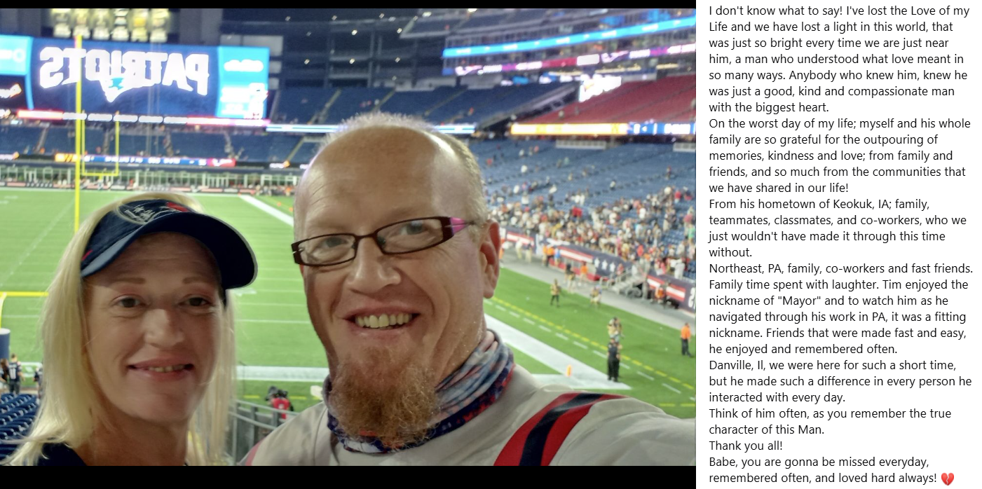 Tim, her husband of over twenty years, passed away suddenly at just 47 years old.