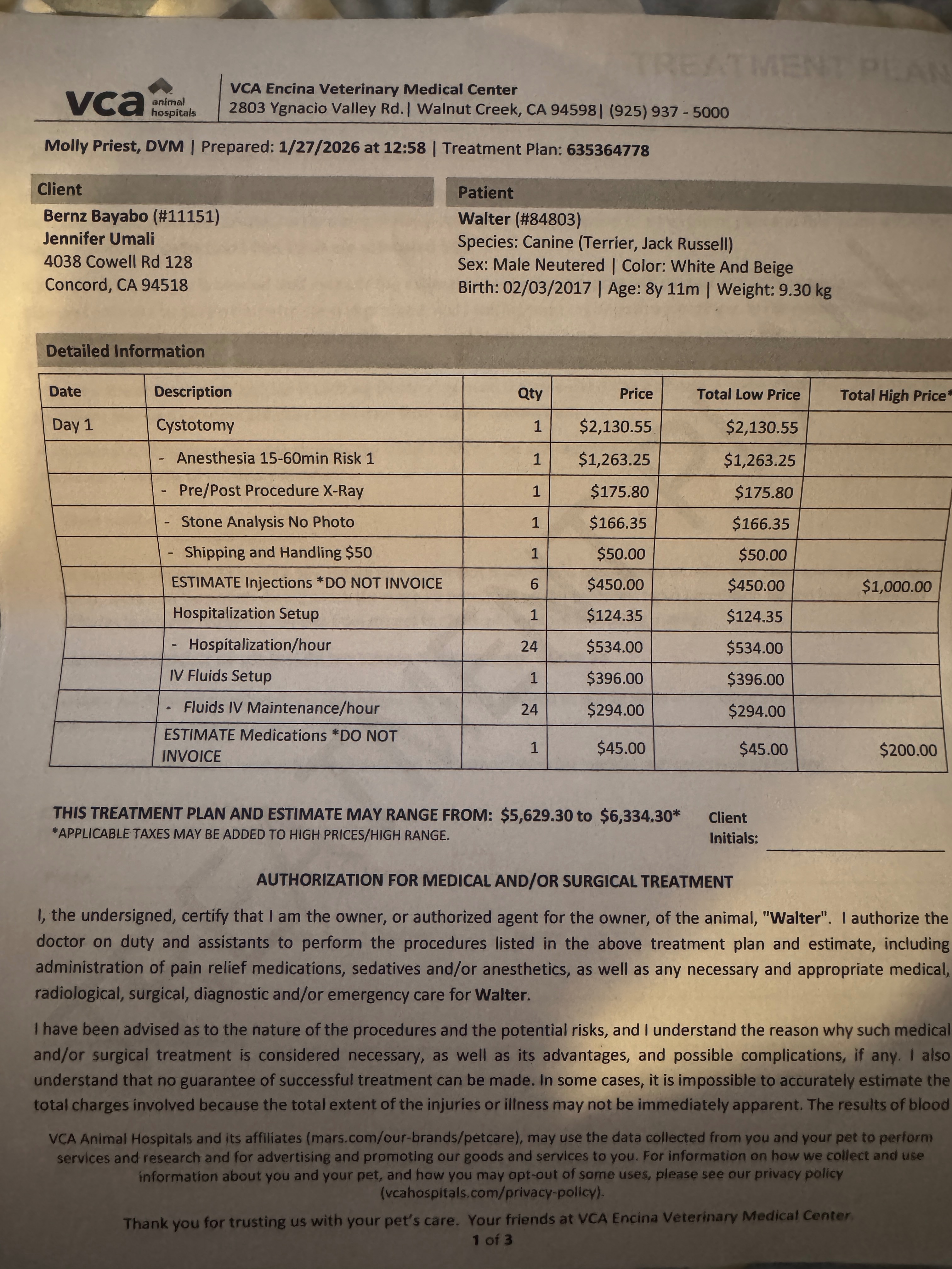 The cost of the surgery is $5,629 – $6,334.30, which is something we simply do not have right now. This is incredibly hard for us, but Walter’s life means everything, and we are doing everything we can to help him heal.