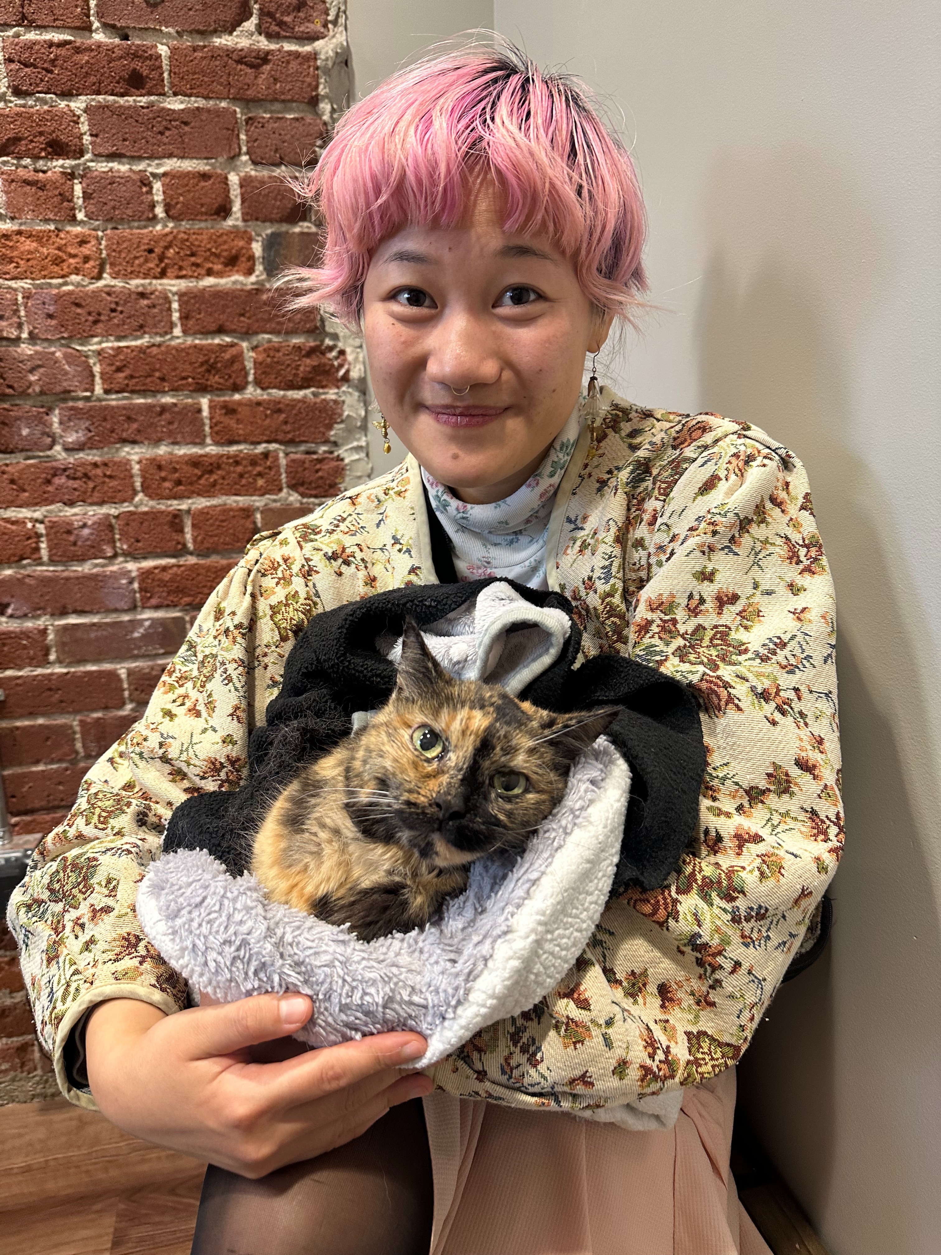 After her surgery, she stayed at the hospital for one night, and the overnight vet team at Remedy kept me updated over text. Within just a few hours of coming out of surgery, the nurses reported that she was giving affectionate head butts and purring, both things she’d barely done the week before. She was cleared to go home the next day, Halloween, and when we picked her up, the nurse who met us said she’d never seen a cat bounce back so quickly after brain surgery.