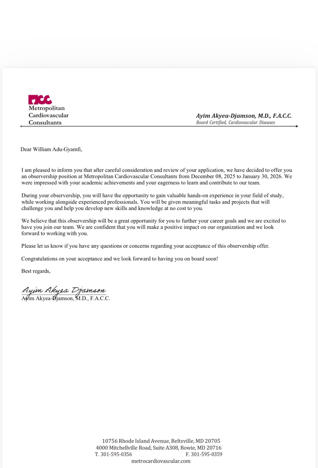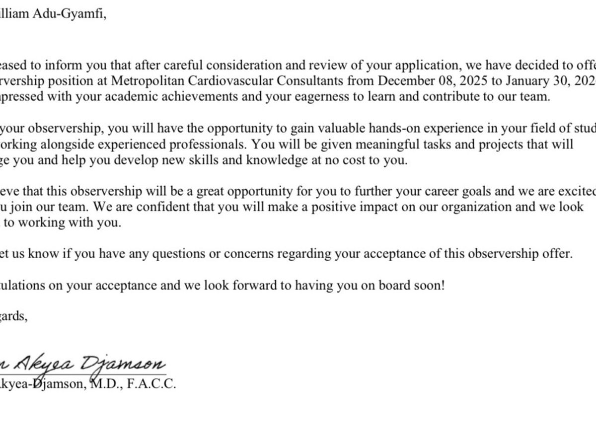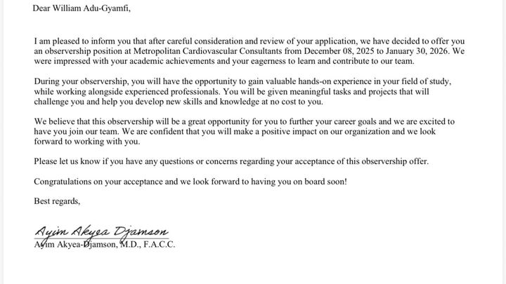 William has been accepted into a prestigious Observership Program at Metropolitan Cardiovascular Consultants in Maryland, USA. His program runs from December 8, 2025 to January 30, 2026, under the supervision of board-certified cardiovascular specialists. This is not just an observership — it is a door opening to William’s dream career in medicine.