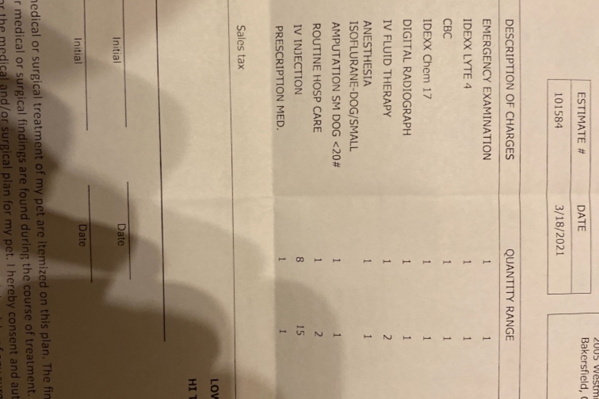 Hi everyone Kristy here! So some odd months back I came across two small dogs (in my mothers neighborhood) both neglected to the point you could not believe they had an owner, turns out they did and screw them. Well a few days ago I was on the Lost dogs Facebook page and came across this “dog found” post (looked like him) and in same location. So I contacted Erin who was the sweet person to take one in. She had said he was missing a foot, which was odd because it wasn’t amputated and he had this weird wound on the bottom. I didn’t really know what to expect. She didn’t have the funds to get him into the vet so I picked him up and took him to the Bakersfield vet hospital and they said his leg needs to be amputated because the bottom keeps dragging. Normally they don’t leave a partial because it drags leaving it to not healing right. If he doesn’t get the amputation he will always have an issue. I currently got him medicine for the wound on the bottom that keeps dragging , pills and a cone to stop him from licking but he really needs further treatment. I’m also needing him to get treatment for his teeth because they are so bad it smells terrible the build up on his teeth crazy. I attached a couple of the bills. This doesn’t include everything else he’s needing like teeth cleaning, shots , everything from food to bedding you name it dogs are not cheap and we want him to be happyfor his next home. Thank you everyone! ❤️