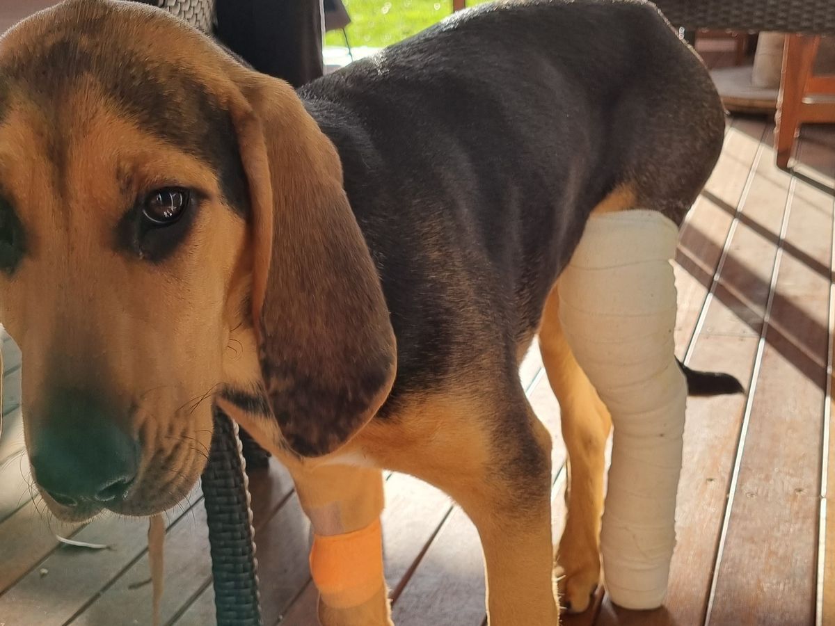 Hi there. My name is winni and I'm a 14 week old bloodhound puppy. I was running around enjoying myself and somehow managed to break my back leg, I'm a bit lanky still and am just finding my feet so I guess I must have come down on it wrong!
