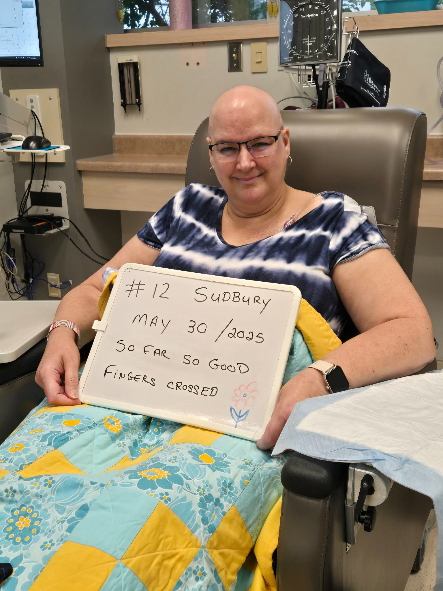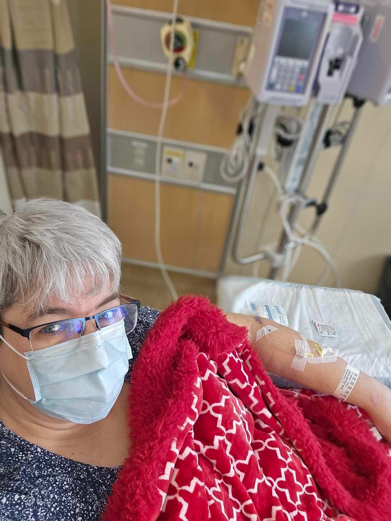 In September after another PET scan she was supposed to have surgery to remove what they could from her breast and armpit then after healing would do radiation for the spots that were now in her chest and neck. Unfortunately when she went in for Surgery the doctor decided to cancel it as the cancer had grown and he felt Surgery was no longer doable. The doctors decided to have her go straight to starting radiation in hopes that would help. She did 6 long weeks of radiation in Sudbury and near the end was SOOOO horribly burnt from it, so dehydrated and exhausted. When I was staying in Sudbury with her for a couple days (November 24th-26th) to help her, on the 26th the doctor met with us after my mom's radiation appointment and was very concerned about how dehydrated my mom was. It was then agreed that mom would stay at the hospital longer after her radiation appointment to get some hydration. When they tried to find a vein, even with using the large vein finder machine they struggled. Eventually (3 pokes and 2 nurses later) they found a usable vein.