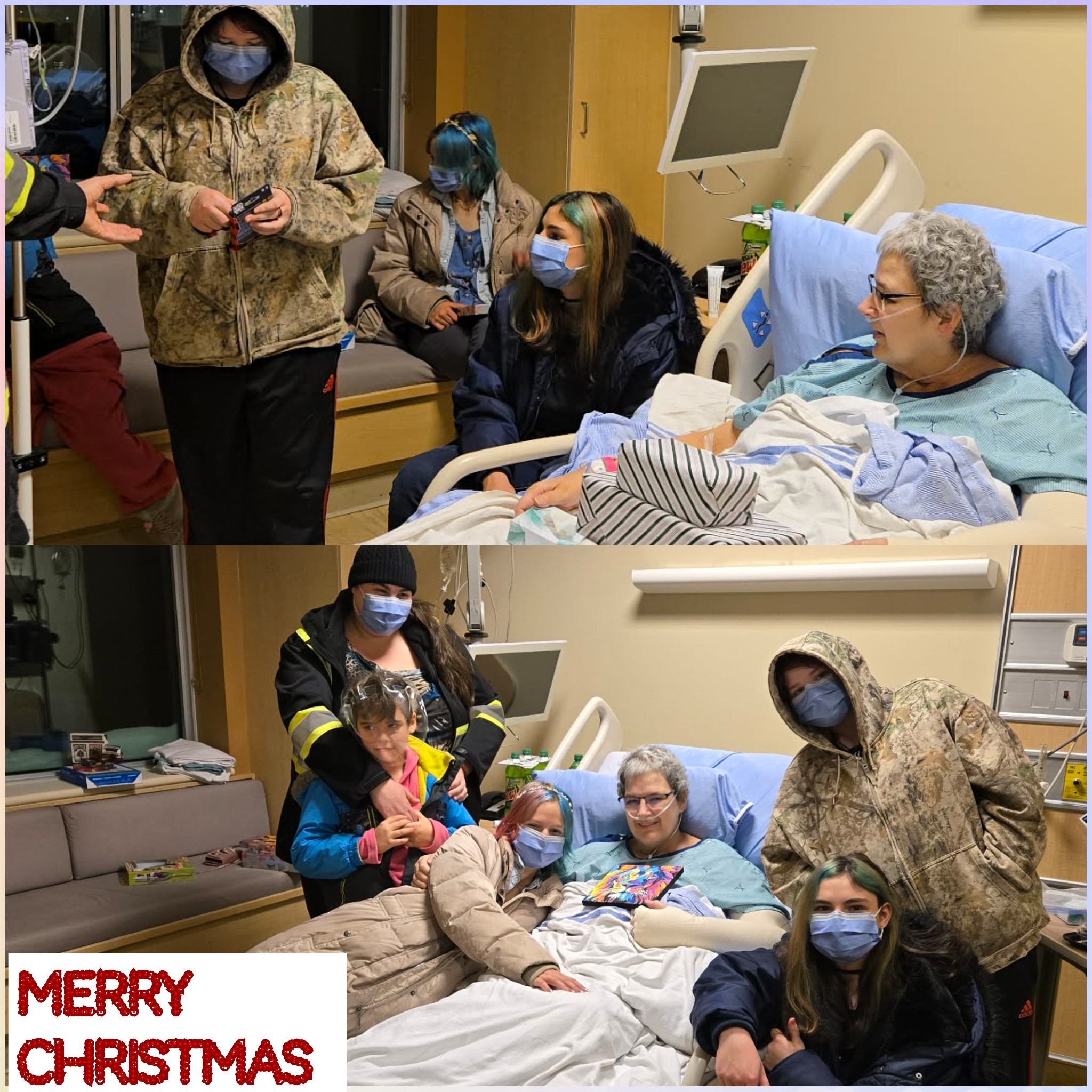 My mom finished radiation on December 8th. At first she appeared to be healing nicely and feeling better but then became sick again and now having a hard time breathing. Not long after finishing radiation in December 2025 my mom was admitted to the hospital again. They began draining fluid off her lungs, about 2 liters the first time. It was hoped that it was just pneumonia but unfortunately was revealed that the cancer had now spread to her lungs. My mom always celebrates Christmas with us with both her and my sister coming to my house so we can do Christmas together with my 4 kids/her Grandkids. This year we had to celebrate Christmas at the hospital. My mom was kept in hospital until a week after New years continually having her lungs drained and still has the tube with a bag attached now to continue to drain the fluid while at home with visits from Home care to check on her. Due to the cancer and fluid around her lungs my mom is also on Oxygen requiring an Oxygen machine while at home and Oxygen bottles when traveling to appointments. The hope is to start her on Chemo again ASAP. Through everything my mom also continues to try and keep a smile on her face especially for her Grandkids.