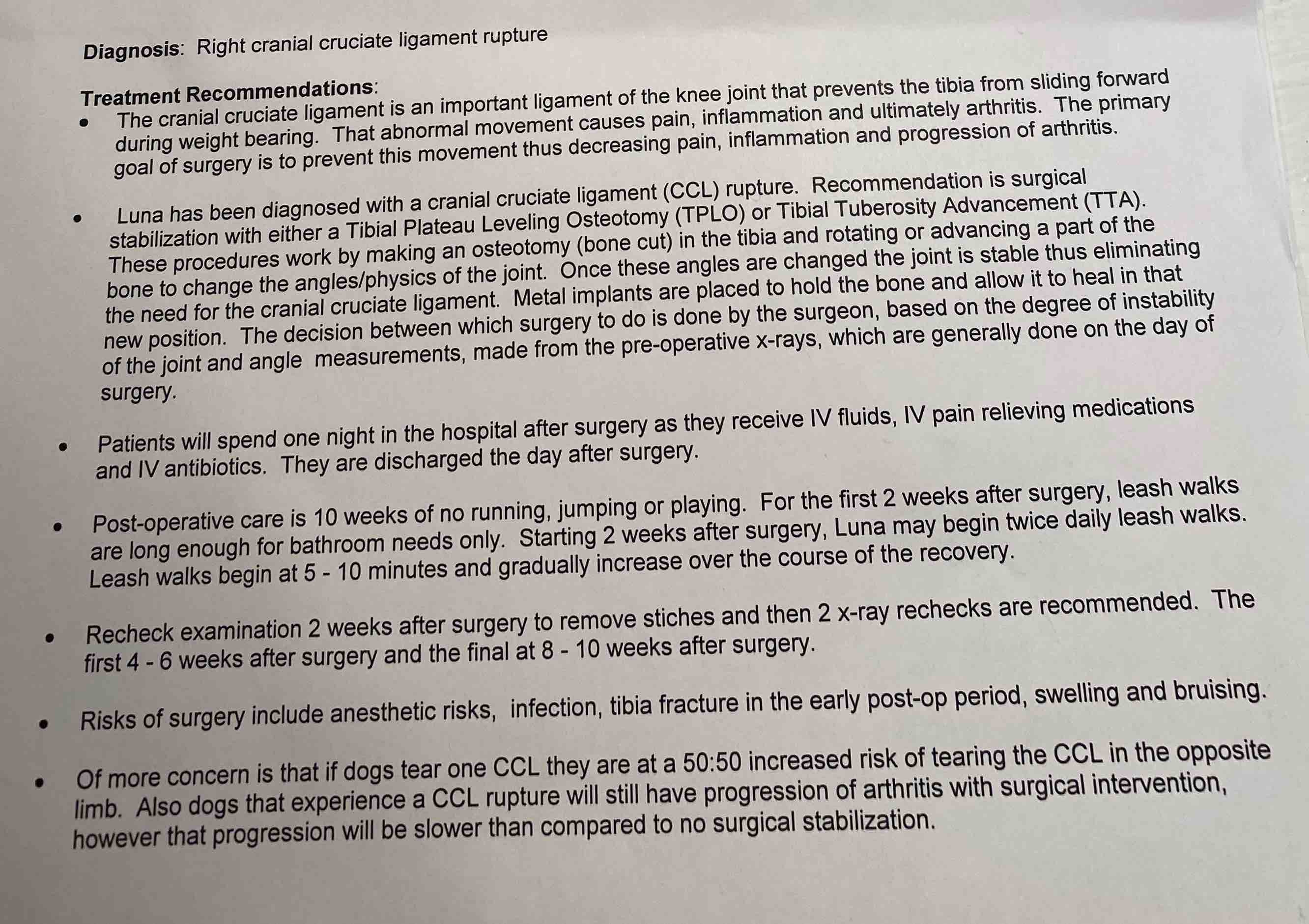 A year ago Luna began limping and was given pain medication for a sprain muscle. Six months later, she would limp all the time and the x-rays found a CCL injury (ACL for humans). On April 4th, we had an appointment with a surgeon and we were told she needs surgery as soon as possible.