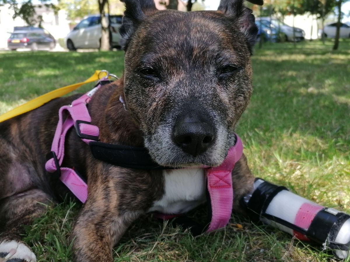 My gorgeous Vida was diagnosed with cancer tumor in her left back leg last Wednesday the 9th of August, what they think it is an osteosarcoma. This is the reason why I had to close my pigeon rescue temporary because I'm on my own and I can't take anymore sick or injured animals atm. She was misdiagnosed in first place at the end of May with cruciate ligament injury, but the previous vet never did any xrays or anything so she was being treated for ligament injury, but her leg just started to get worse and worse, to the point that she doesn't use it at all and got very swollen. She is on very strong pain killers atm, and special care, I have to use a lifting back harness to help her walk, i bought a dog trolley so she can go for rides to the park and have a little sniff around. She had a heart episode on the 24th of July which the vet from RVC believes it was related to the pain in her leg, as she had an ultrasound in her heart last Wednesday also, but luckily her heart looks healthy and doesn't show any sign of heart disease. She went as an emergency to the Royal Veterinary Collage yesterday afternoon and she stayed overnight, they will do xrays, a CT, blood tests and a biopsy from the bone today. I'm just really hoping the tumor is just located in her leg, and in that case she will have the leg amputated and she can have few more happy years.