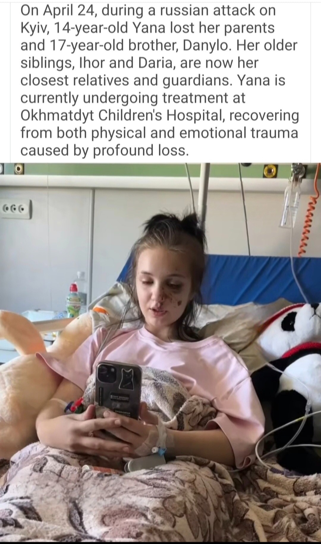 On April 24th, there was a missile strike on the city of Kyiv. During the missile strike, both of Yana's parents and her older brother were killed and the apartment destroyed.