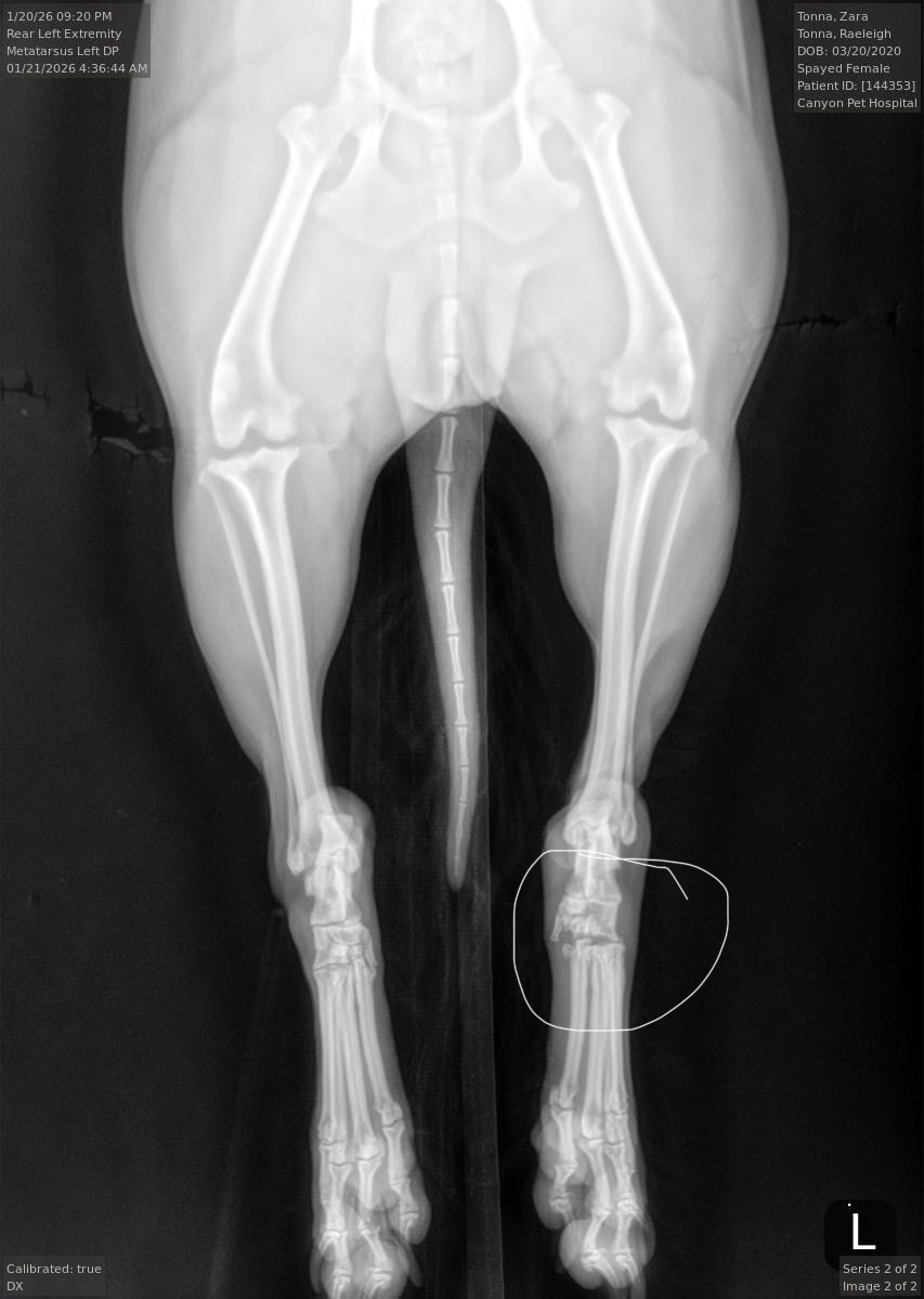 Recently, Zara suffered a devastating freak accident. She experienced a severe joint dislocation in her hind leg where her ankle became separated from her toes. We are now faced with an impossible decision: attempting a surgical fusion or amputating her leg.