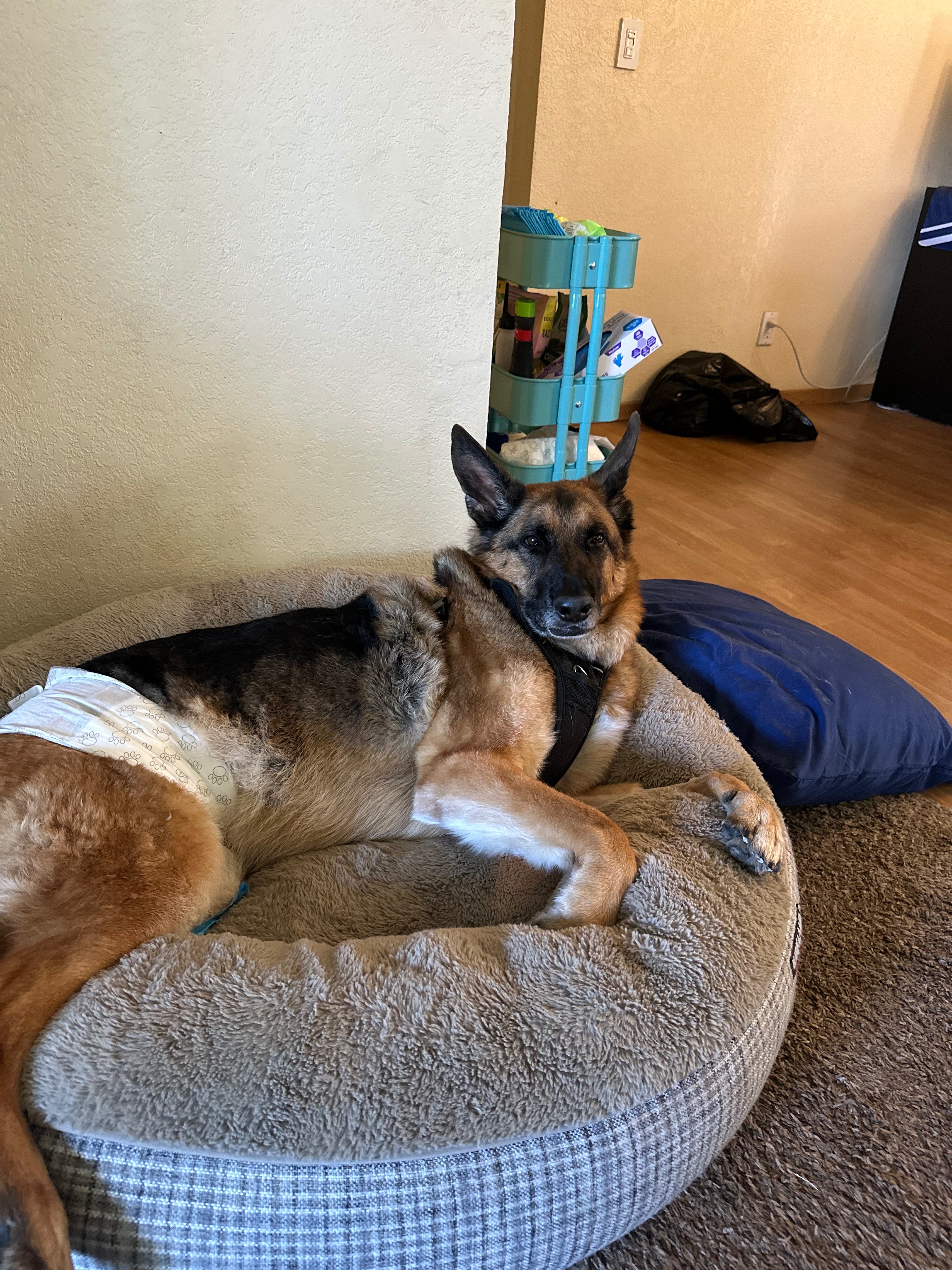 My name is Alicia and this is my sweet boy Zeke. On July 5th, Zeke suddenly became paralyzed in his hind legs, and we rushed him to the emergency vet. There, we found out he was preliminarily diagnosed with Intervertebral Disc Disease, also known as IVDD. With this, he has lost all mobility and feeling in his hind legs, as well as having no bladder control. We are choosing to go the conservative route for therapy. This means a minimum of 8 weeks of strict crate rest and medicine. It also means he will need laser and acupuncture treatments, as well as physical therapy. Zeke is 105 pounds of pure love, so transporting him to a vet is impossible right now. We are raising funds for a mobile vet, which is a lot more expensive, to be able to get the treatment he needs as well as his medications.