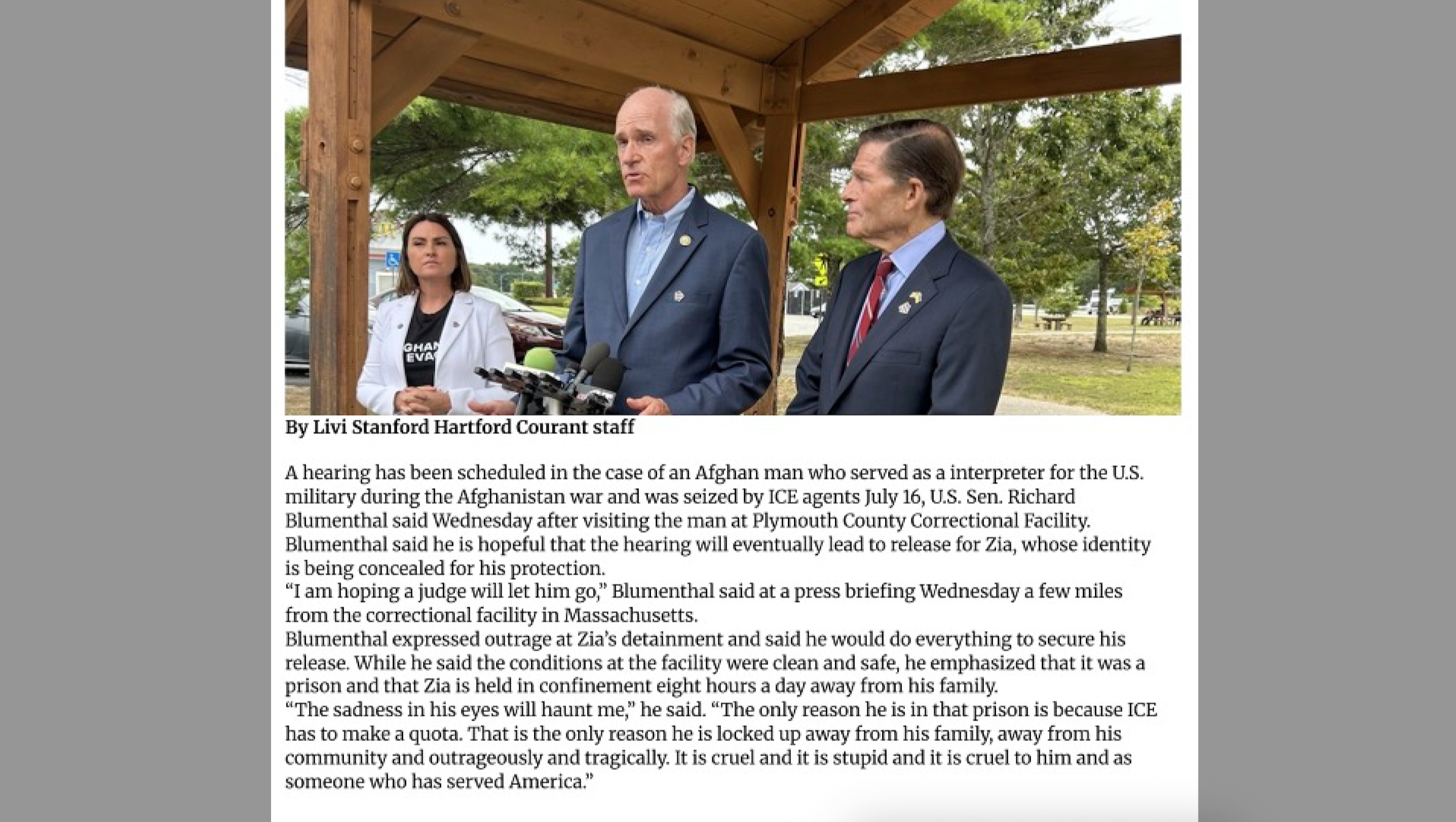 Conversation between Senator Dick Blumenthal; Congresswoman Jahana Hayes; Congressman Bill Keating; Shawn VanDiver, Founder of AfganEvac; Kyleanne Hunter, CEO of IAVA; and Lauren Petersen, Immigration Attorney regarding Zia's detainment.