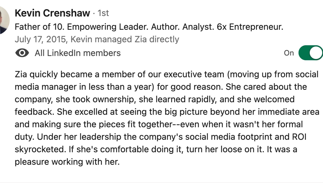 LinkedIn: See my experience and work background here: https://www.linkedin.com/in/zia-holte-a9b46319/
