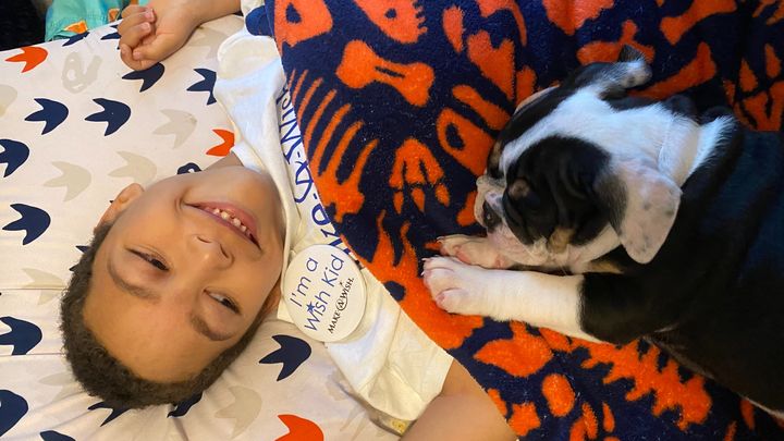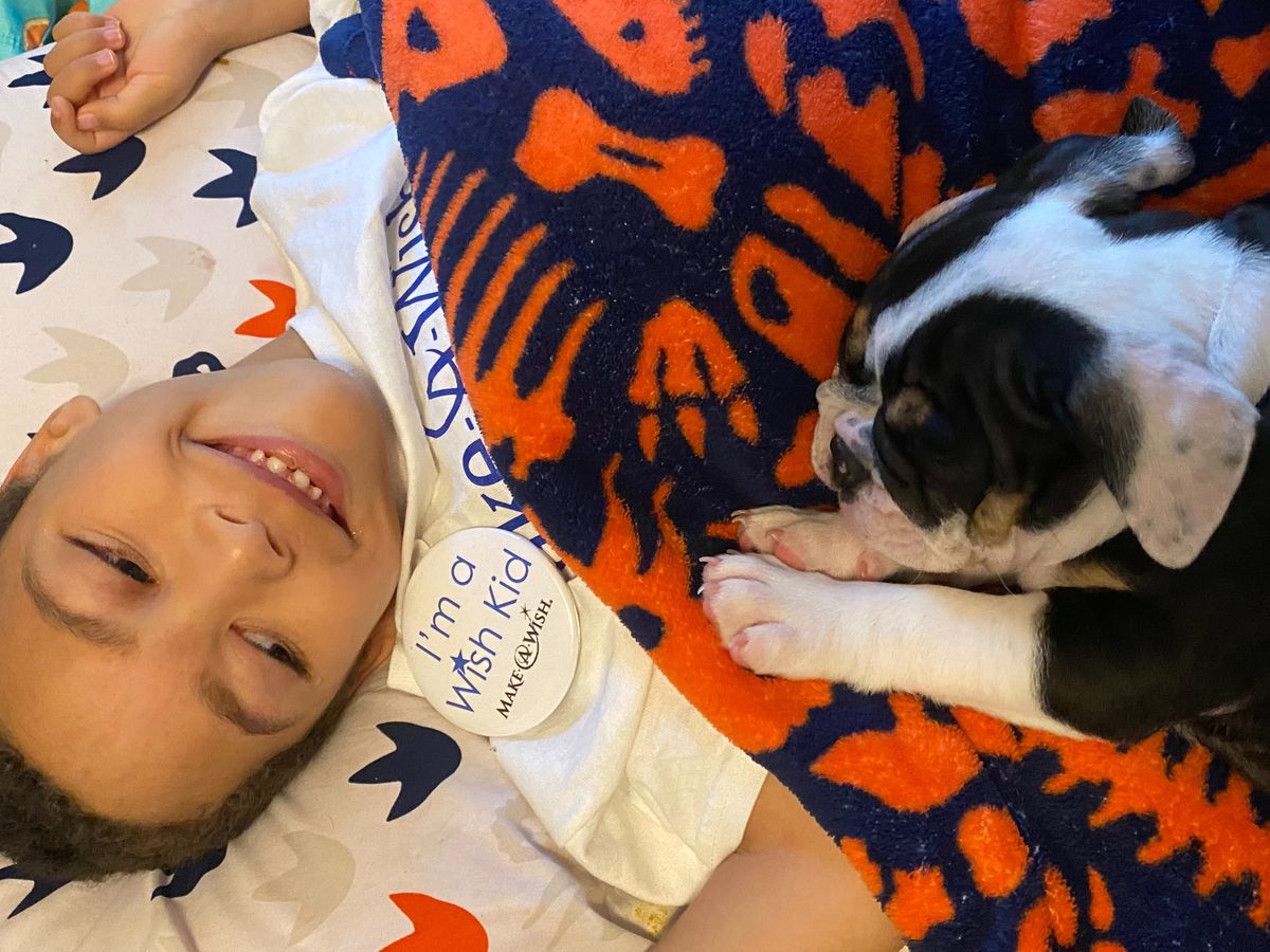 This is Zion and Rosie. Zion is our AMAZING 5 year old son. Zion has had medical issues for his whole life. He is non-mobile and nonverbal. He uses a wheelchair. Eats 100% by gtube. He also suffers from severe epilepsy. Last May, he had a 40+ minute tonic clonic seizure and I thought we lost him. Fortunately he was able to be revived and came back to us! After Zion had that seizure, it made his condition seem more real so we looked into Make A Wish. I truly feel like Zion deserves all of his wishes to come true, so this was an amazing opportunity for him! Because of covid, choosing a wish was more difficult. No travel wishes were being granted so we decided that the next best thing would be a new pet. We chose an english bulldog and about a month later we got her! From the minute they met, they have been best friends. Zion is unable to move on his own, but Rosie will lay with him or run around so he can watch her. She has been the best thing for Zion!