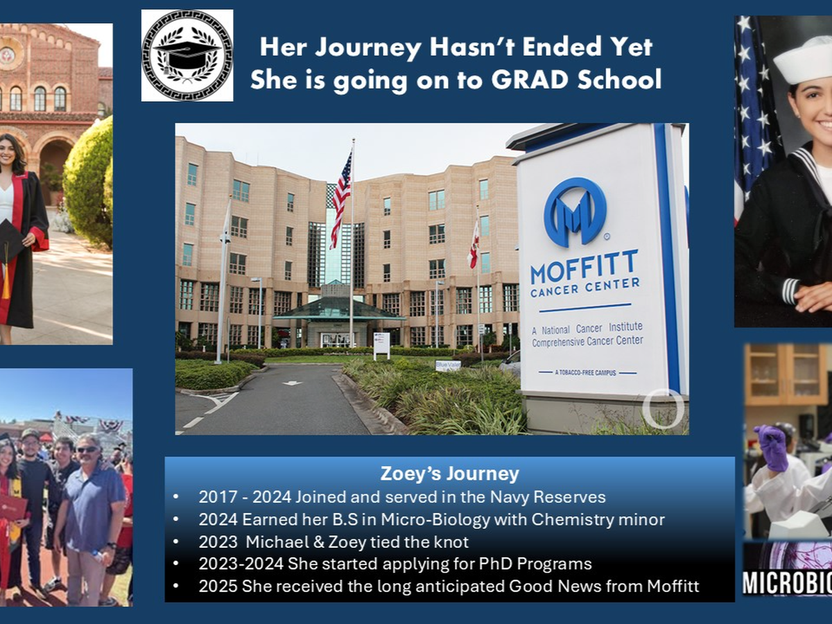 I'm sure you already heard the good news. After 2 years of applications, interviews, waiting, and praying, Zoey has been accepted into the Cancer Biology PhD Program with the Moffitt Cancer Center located in Tampa, Florida. Zoey and Michael will be moving to Florida mid-July sometime, which doesn't give them much time. Picking up and moving clear across the country is not cheap. Moffitt is covering the moving cost of their belongings. However, they will still need to come up with first and last month's rent, food, gas, and meals to help them get settled in through the start of the academia in late August. I am reaching out to family and friends to help raise some funds to assist with the cost, as they begin this new and exciting chapter. We are thankful for all the love and support she has received from everyone throughout her journey. I appreciate whatever amount you are able to give. Every dollar will help.