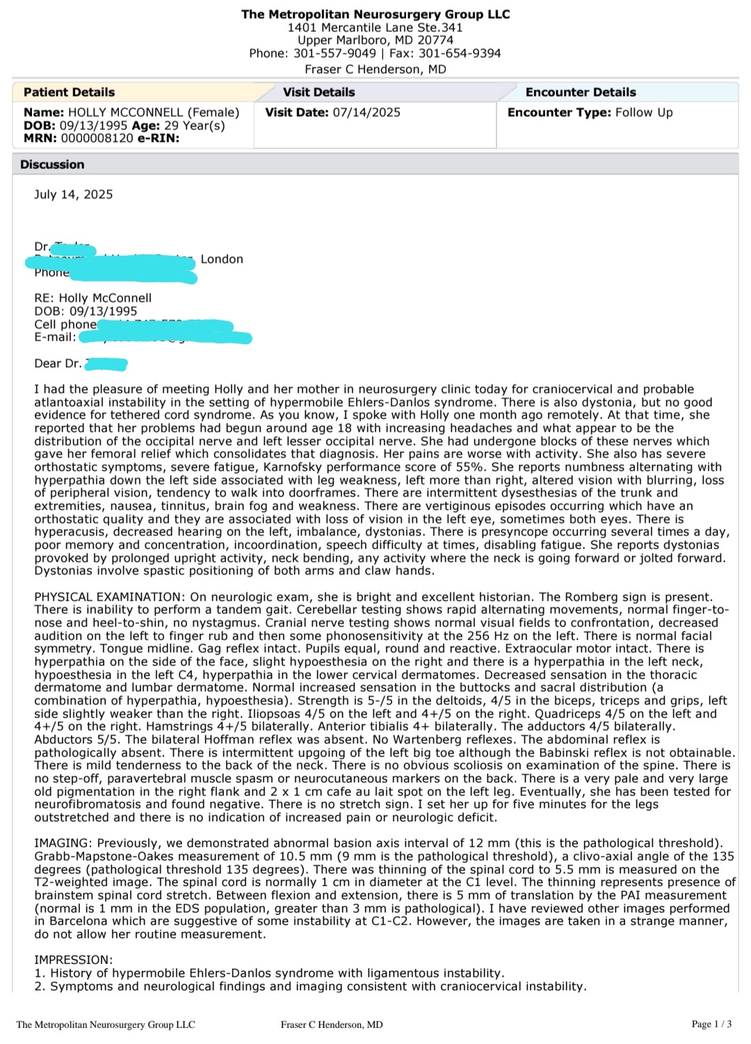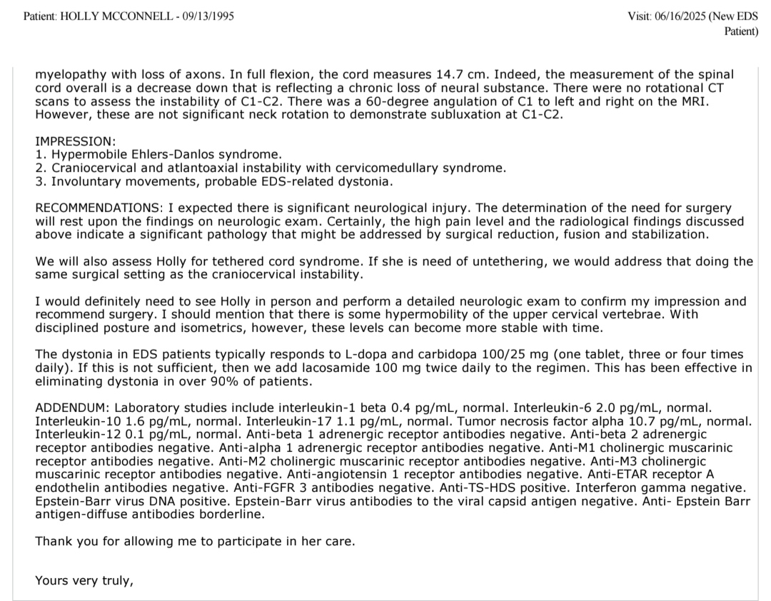 MRI and CT imaging have confirmed I have Craniocervical and Atlantoaxial Instability in my neck causing my spinal cord to be abnormally stretched and compressed, leading to cervicomedullary syndrome. You can read a more detailed explanation in the medical reports attached to this fundraiser or by clicking here