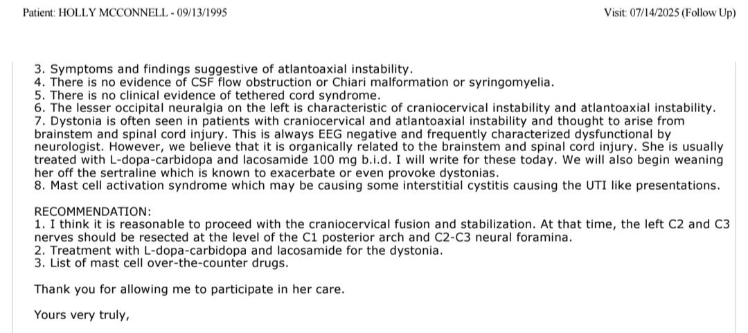 The recommendation is a craniospinal fusion and stabilization from the Occiput (skull) to C2, a bilateral Occipital neurectomy and left C3 neurectomy. In the future further surgery might be necessary to fuse my spine from C2 down, but for now it has been recommended we avoid this.