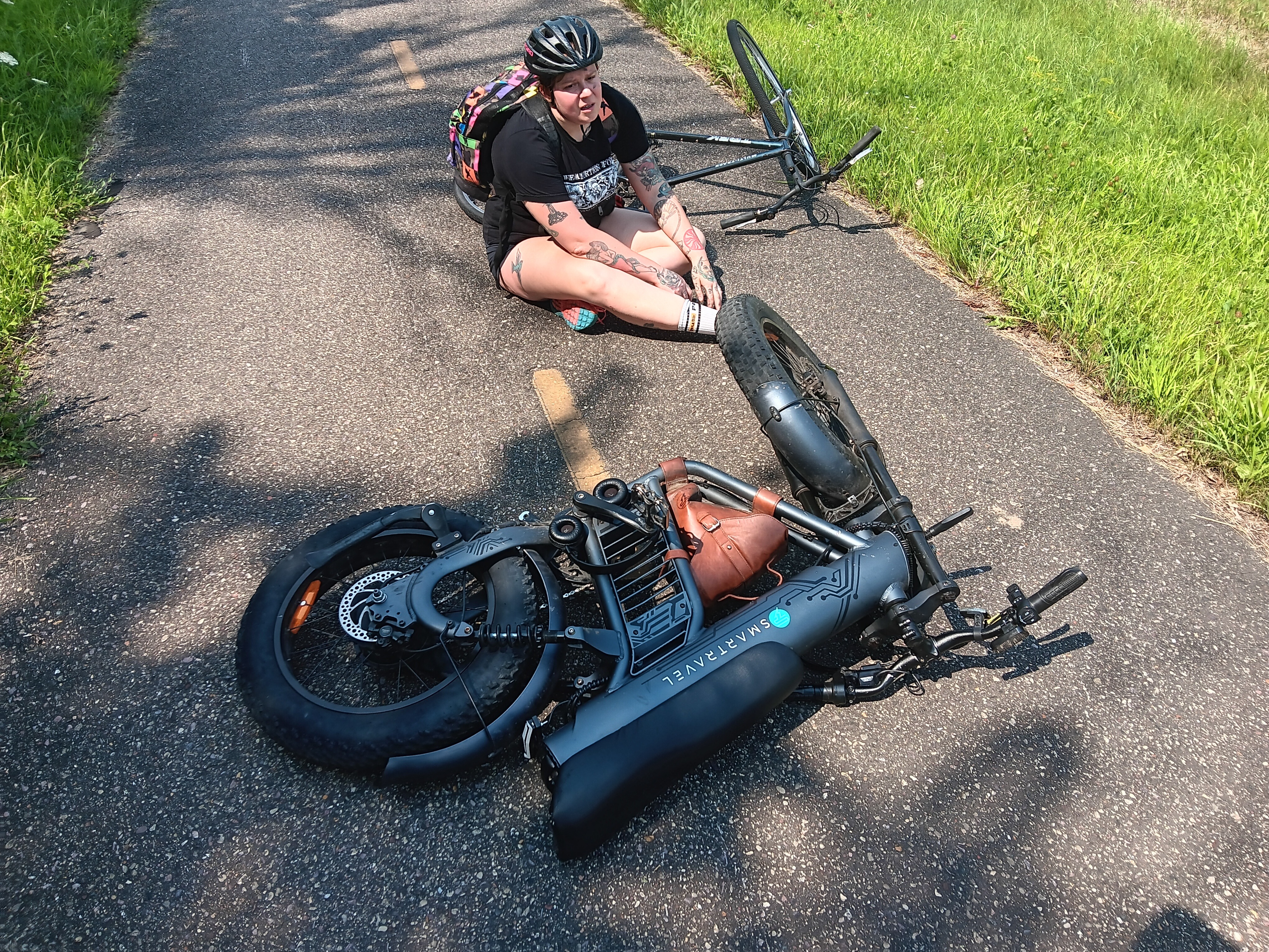 On August 5th I was riding home eastbound on the designated bike trail along highway 12 when I suddenly felt an impact and saw black. Upon "coming to" on the pavement, I looked around and realized I had been struck from behind full speed by the larger bike you see in the photo for this campaign. Thanks to my community I have learned that the bike I was struck by exceeds the maximum capacity for an "e-bike" per Wisconsin Act 34. Unfortunately the responding sheriffs did not identify this and there were no citations related to the actual impact itself, whether from the illegality of what hit me on the bike trail or the admitted negligence of operator of the bike who claims they simply "did not see me."