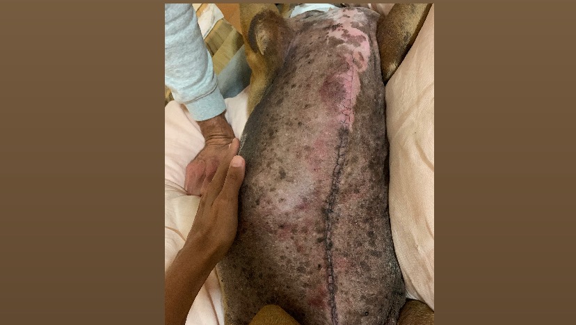 Hi all ! We are Kirra’s parents, Lu and Jake and we have been to quite a journey for the last 3 weeks. After finding out that Kirra had a malignant tumour of 12cm in her vena cava, obstructing 100% of her blood flow in there, we had a very hard decision to make. Leave the tumour there and wait for her to fade slow and/or have a stroke or go into surgery to remove the tumour. We have decided to operate and give her a chance to live but we were told to be ready to say goodbye to our puppy. As a high risk surgery it was likely she wouldn’t survive. Kirra is a real warrior, during surgery she lost nearly all her blood, veins bursted, blood pressure went crazy but after 4 and a half hours of surgery she survived! We took her home for the first time after 5 days and her vital signs were good but suddenly she started to struggle again. She presented blood in her stool, her gums were pale and we rushed with her into emergency again. She had some liquid in her belly and they were trying to monitor it with multiple ultrasounds. It potentially could be an ulcer that perforated her duodeno so the only way to know and/or fix it and avoid complications was to go into surgery again. No perforations, but he took another small mass from her intestines and she needed another blood transfusion, remaining in clinic for another 5 days. Kirra arrived home yesterday 28/07 and is recovering slow. We are giving her some special prescription diet, lots of medication and loads of love. She will be back in clinic tomorrow for a check up but we will have to keep on going with treatments and special diet, since she had cancer.