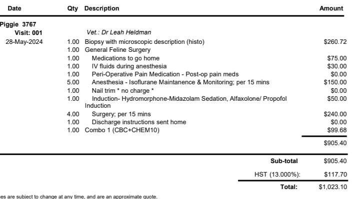 Below I have the quote for Piggy's surgery, without the tooth removal included. They had told me that will be an additional $200 or possibly more. I am awaiting an updated quote (to which I will include), but aiming for $1200 preemptively.