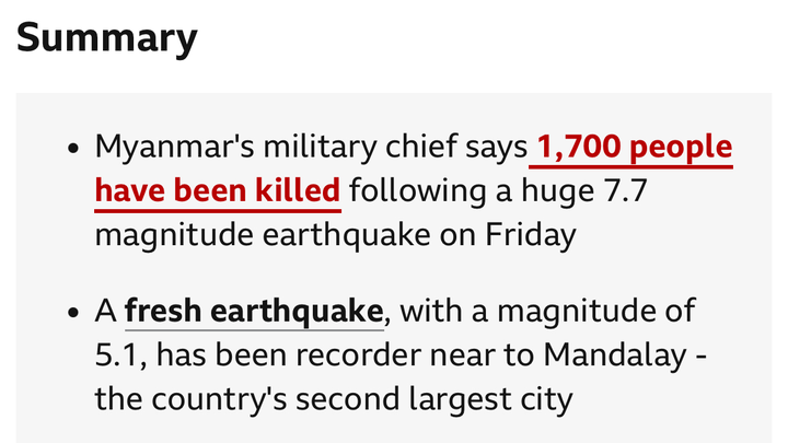 I am fundraising for the people of Myanmar affected by the 7.7 mega earthquake in Mandalay and Sagaig on the 28th of March. There is a little rescue ongoing to to limited resources at the moment. Your donation will go as far as rescuing people out of the collapsed buildings to basic food and water and medical aids. Thank you for your donation.