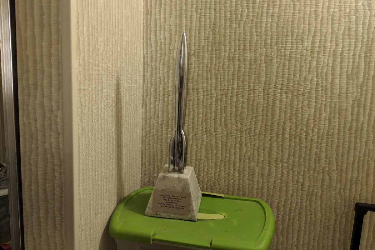 The Hugo in the photo is from the 1986 World Science Fiction Convention, Confederation. It was awarded to Judy-Lynn del Ray, in the category, Best Professional Editor. Sadly, she passed away before the award ceremony. Her husband, Lester del Ray, declined to accept the award for her. It has been at Don and Samanda's home ever since.
