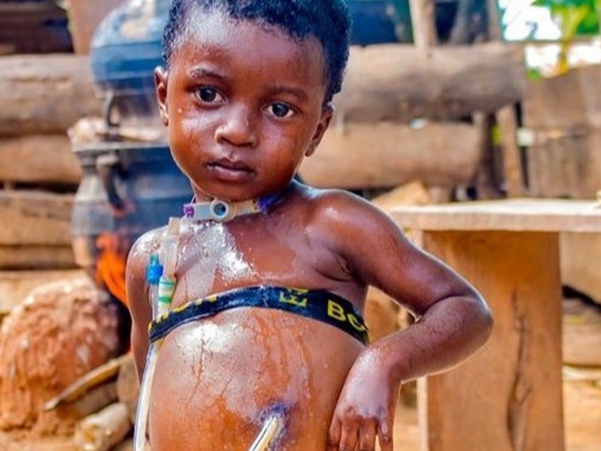 The pictures below depicts the need for compassionate medical care. It is an unfortunate situation and ultimately an “eye-opener” to us all. It is also a stark contrast to the level of medical treatment that we take for granted. The picture tell the story of four-year-old Joseph A who lives in a small village in Kumasi Ghana. At age two, little Joseph ingested a cell battery sustaining significant damage to his esophagus. This resulted in the placement of a feeding tube and tracheostomy tube but there’s additional need for surgical intervention. The feeding tube is secured to his upper body by an elastic band. His sparse clothing often exposes his abdomen, increasing the risk of infection at the surgical site.