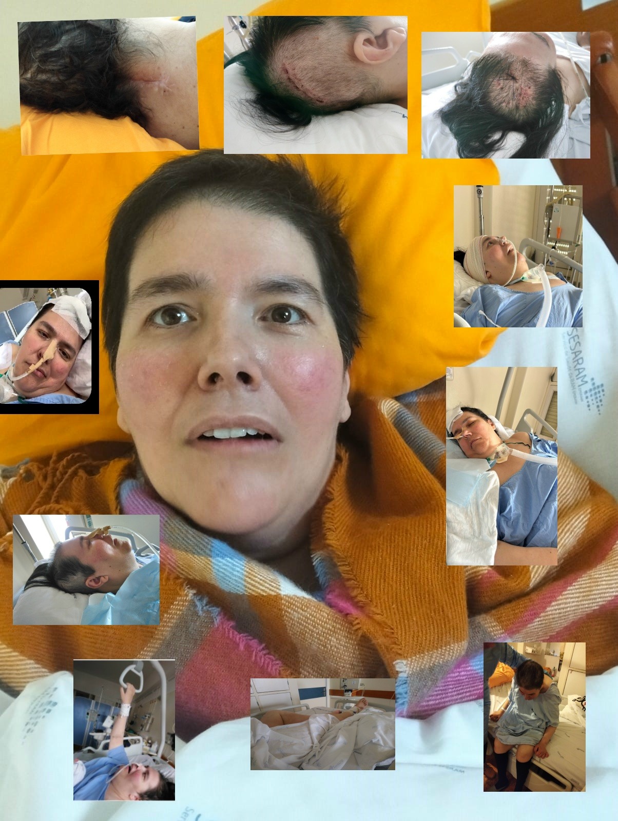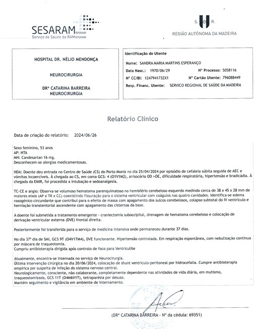 meu nome é Sandra Martins e enfrentei um desafio severo a 25 de abril de 2024 com um AVC Hemorrágico que afetou profundamente minha vida. Eu estive em coma induzido por dois meses depois de algumas cirurgias incluindo colocação de shunt ventriculo-peritoneal por hidrocefalia" dreno interno entre cérebro e estômago" me alimento por uma peg/tubo, lentamente comecei a mostrar melhorias, estou cônscia, ouço, vejo e até escrevo num caderno o que quero dizer e não posso, tenho movimentos perfeitos dos membros inferiores e superiores apenas o braço esquerdo precisa de uma ajudinha