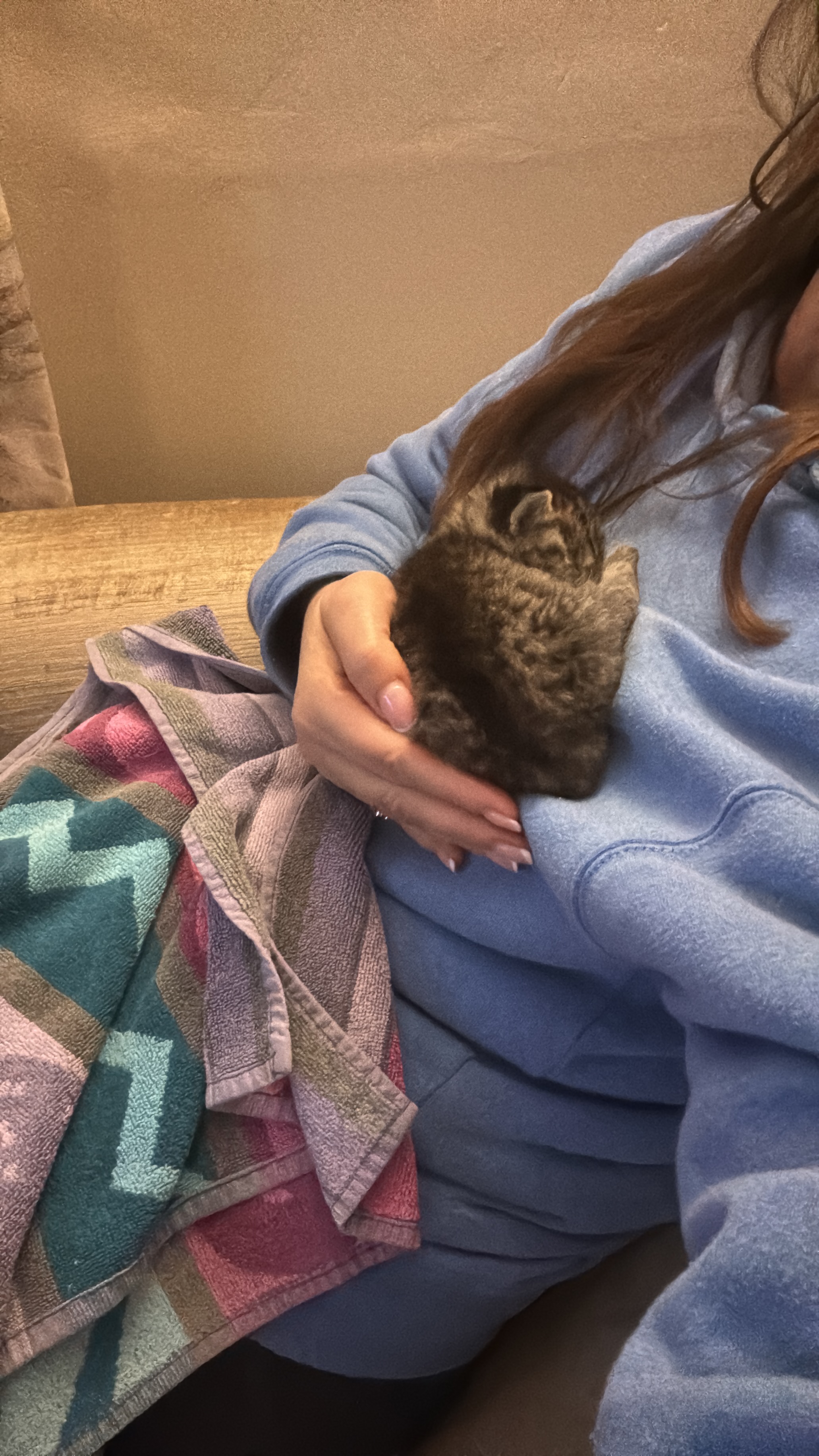 I instantly scooped up the kitten and took them home. I’m not sure of the sex yet, as still so young, but having reared baby animals often before, luckily I’m equipped and able to help.