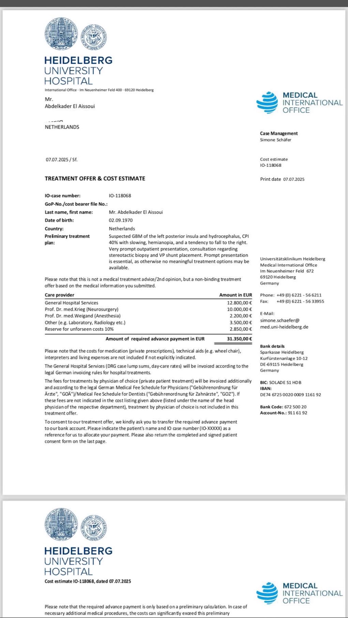 Daarom hebben wij onze hoop gevestigd op het Universitair Ziekenhuis in Heidelberg (Duitsland). Daar staan specialisten klaar en adviseren met spoed: