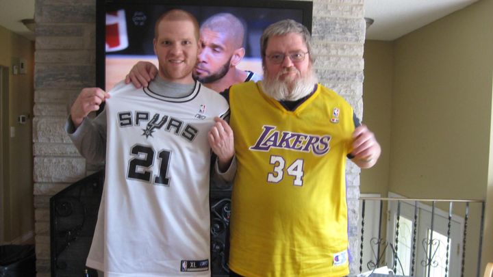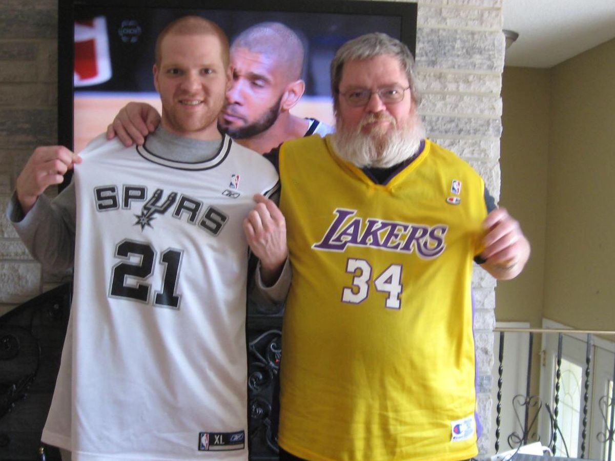 Our brother Rene Jr is a sports nut too and together they rant, rave, curse and compete for money, it’s not much money, it’s the bragging rights that means the most. The photo is the two of them on a Sunday afternoon and yes, if it looks familiar this was photo bombed by Tim Duncan from the San Antonio Spurs! It was featured on USA Today Sports, reddit, imgur and more.