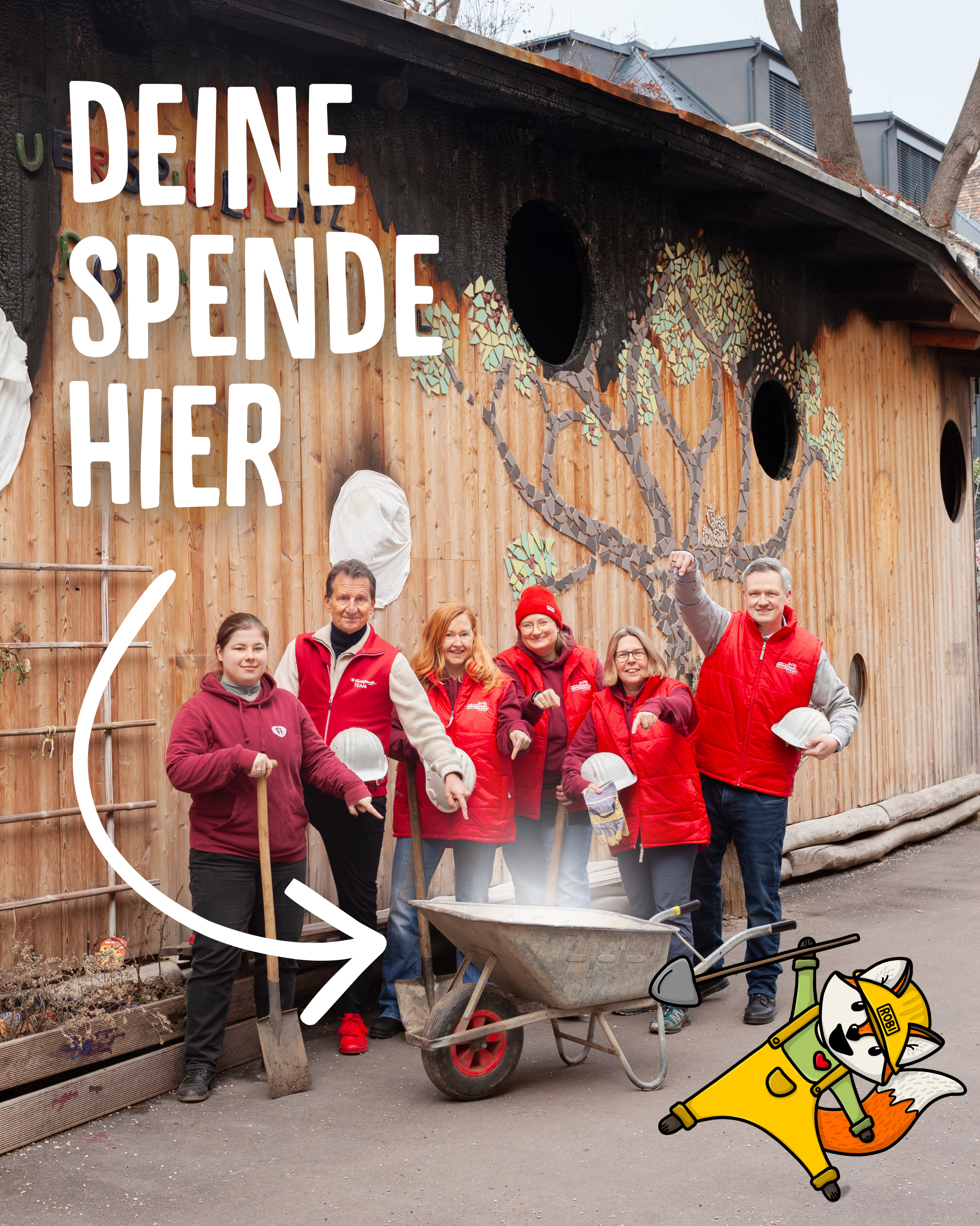 Bei Spenden bis 100 € erhaltet ihr einen Button mit unserem Baustellen-„Robi-Fuchs“ – ein kleines Symbol dafür, dass ihr Teil dieses Wiederaufbaus seid.
