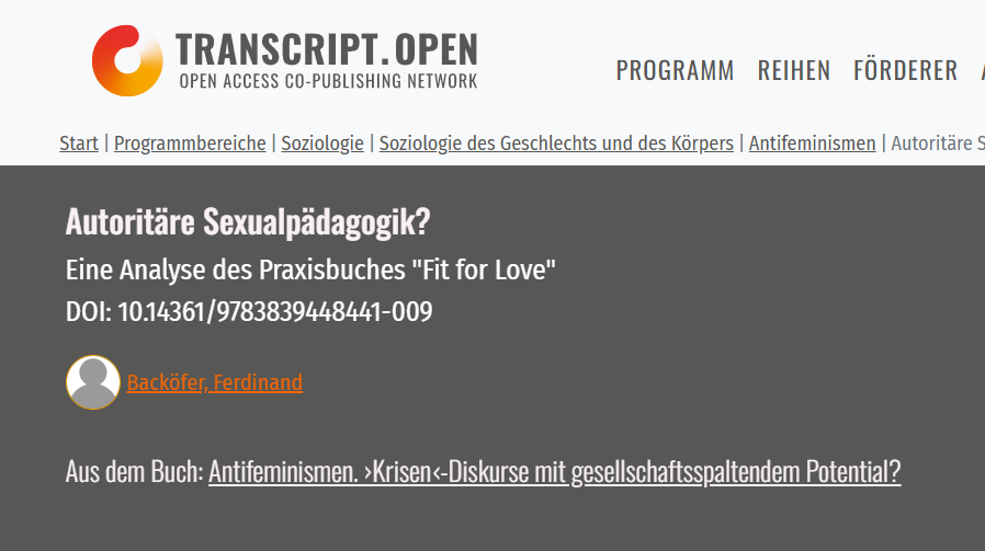 Im Rahmen eines Forschungsprojektes über Antifeminismus habe ich einen Artikel geschrieben, der sich mit einem konkreten sexualpädagogischen Konzept kritisch auseinandergesetzt hat. Dabei habe ich herausgearbeitet, wie die Publikation hinter einer vorgeblich liberalen Fassade auf klassische Elementen des antifeministischen Diskurses um „Gender“ und moderne Sexualpädagogik zurückgreift – und dabei höchst zweifelhafte Methoden empfiehlt. Dazu zählt etwa das wiederholte An- und Abkleben eines Klebebandes vor Jugendlichen, um zu „demonstrieren“, wie sich die menschliche Bindungsfähigkeit mit wechselnden Partner*innen zunehmend „verbraucht“. Der Artikel kann hier nachgelesen werden.