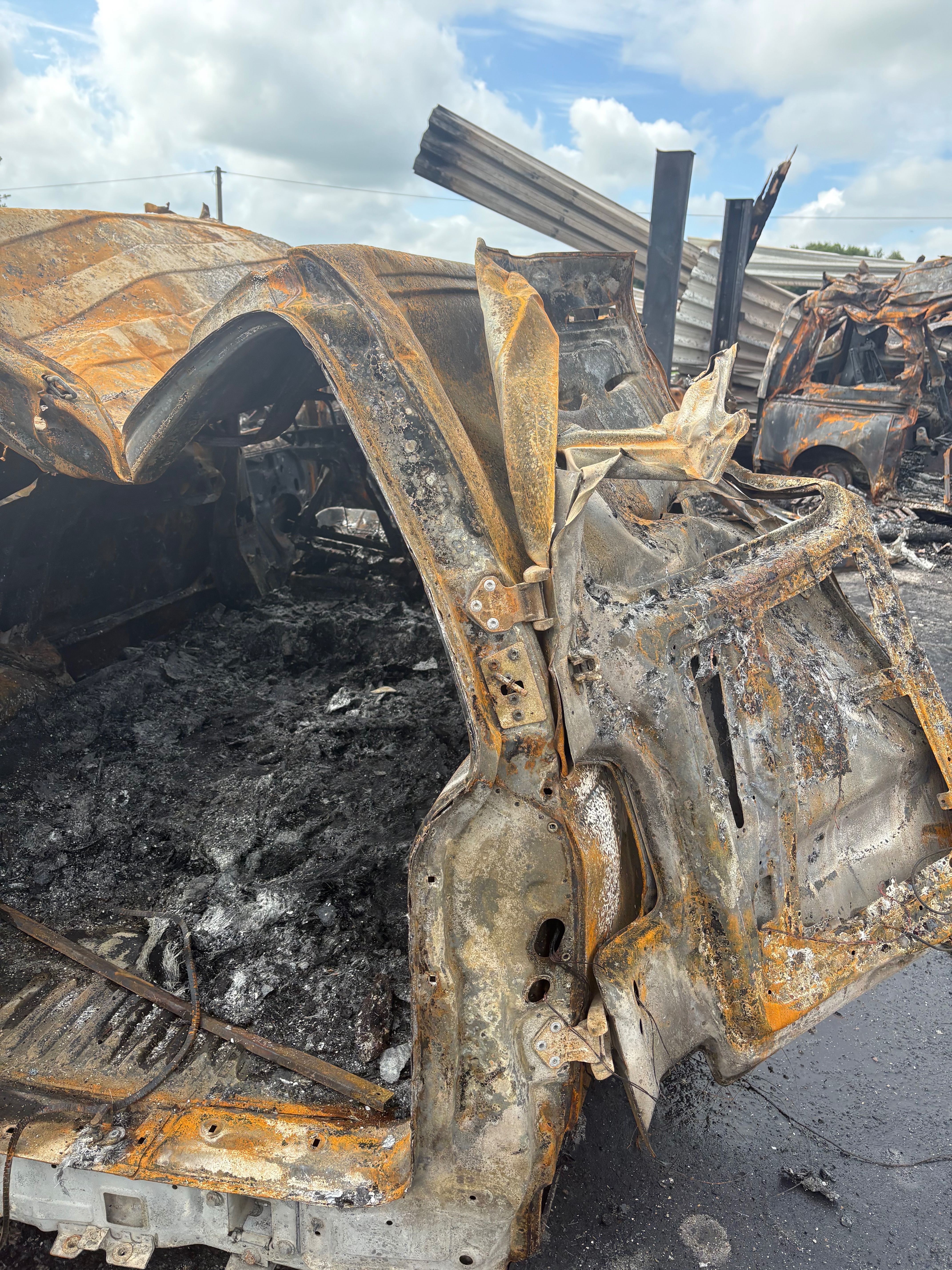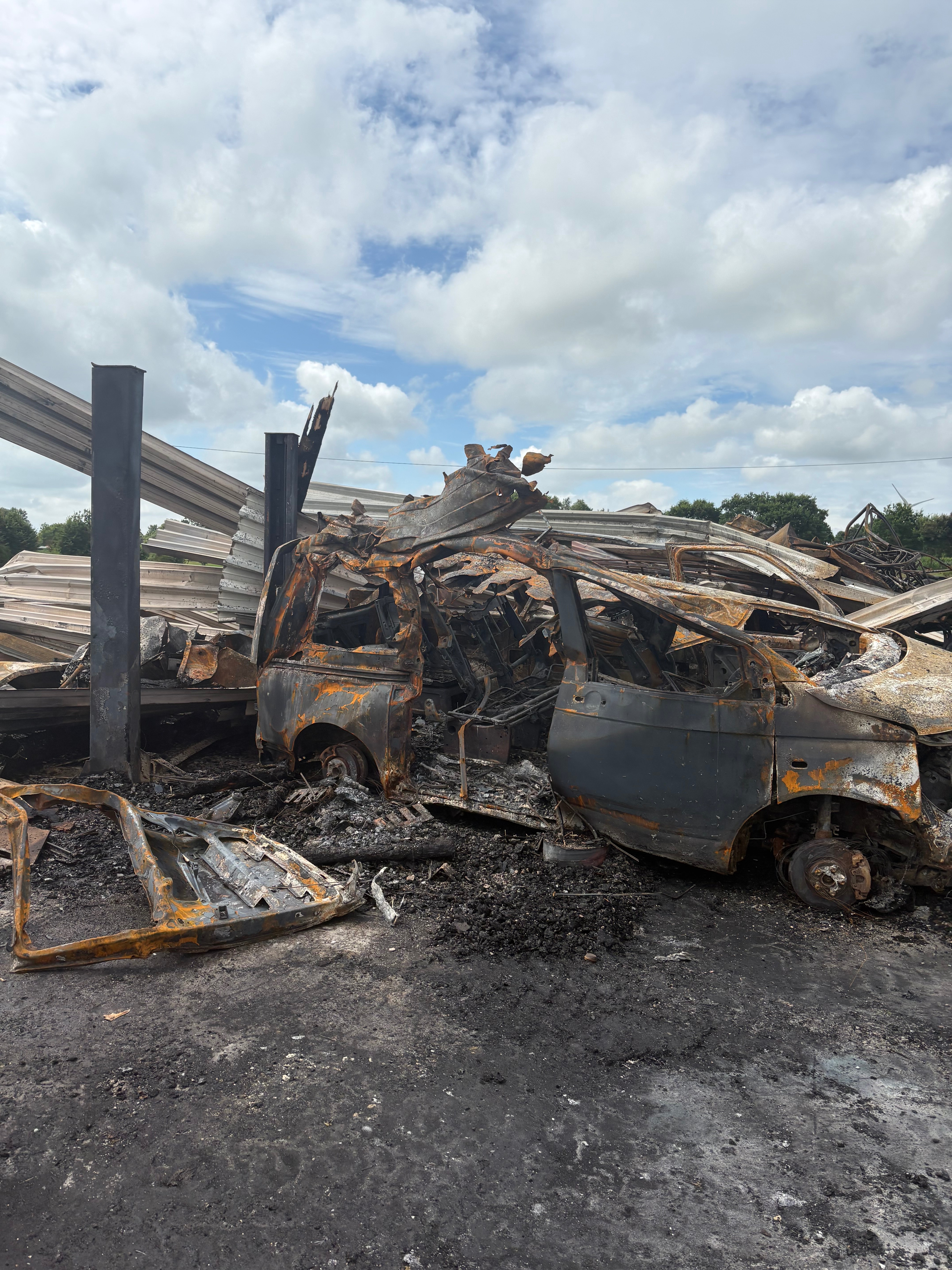 • Und besonders tragisch: der alte Käfer eines Freundes, ein echter Liebhaberwagen, der nun nur noch Schutt und Asche ist