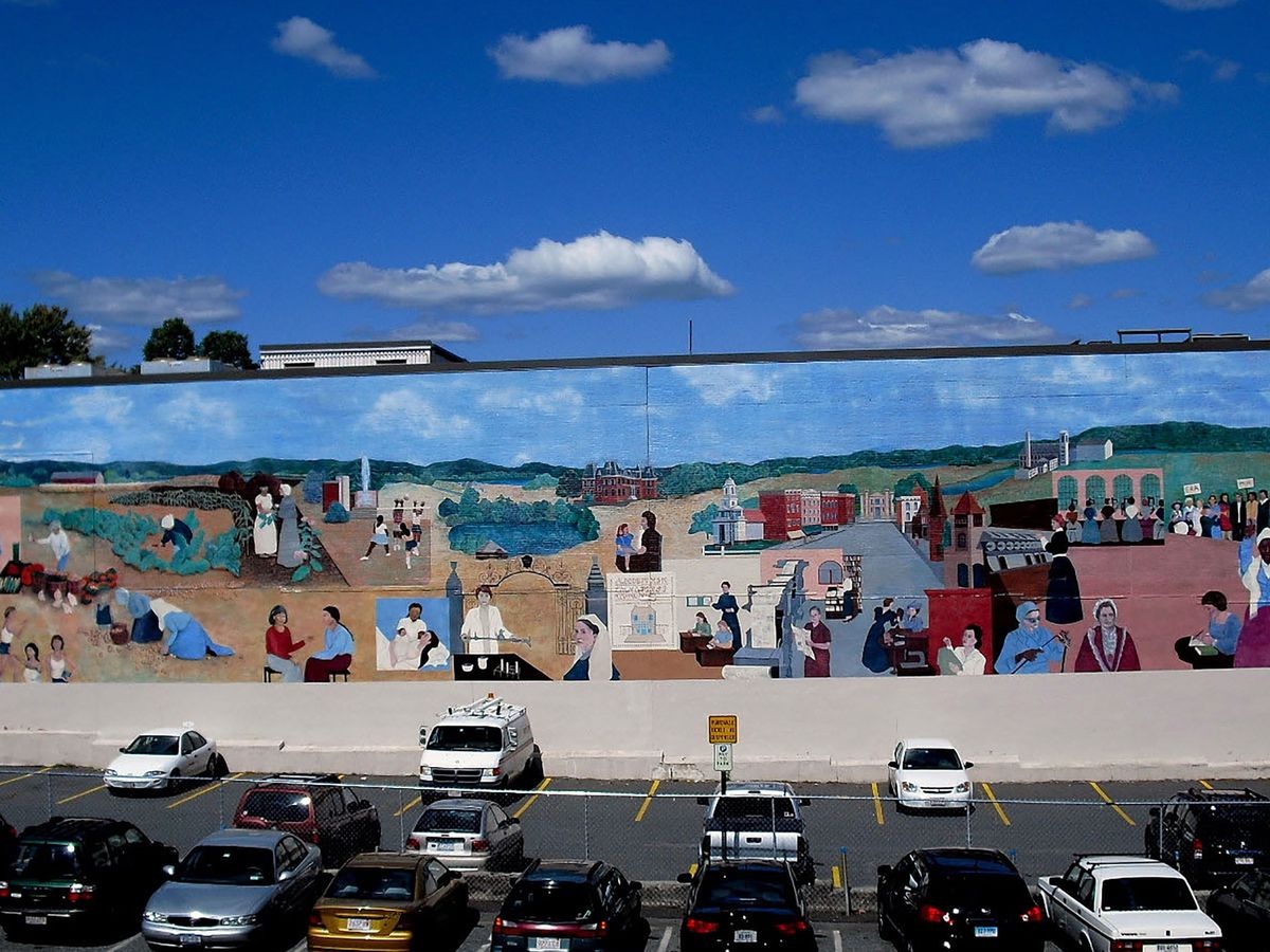 The mural was painted in 1980 by the Hestia Art Collective (Linda Bond, Mariah Fee, Susan Pontious, Rochelle Shicoff and Wednesday Sorokin), is 35' x 100', located in Northampton Massachusetts and remains the largest mural in western Massachusetts. The imagery is the result of two years of original research and depicts women's contributions to Northampton in the home, the arts, education, business, industry and politics. Since its completion, the artwork has been used in local schools and colleges as a teaching aid for local and women's history. In 1986 it received the Governor's Design Award.