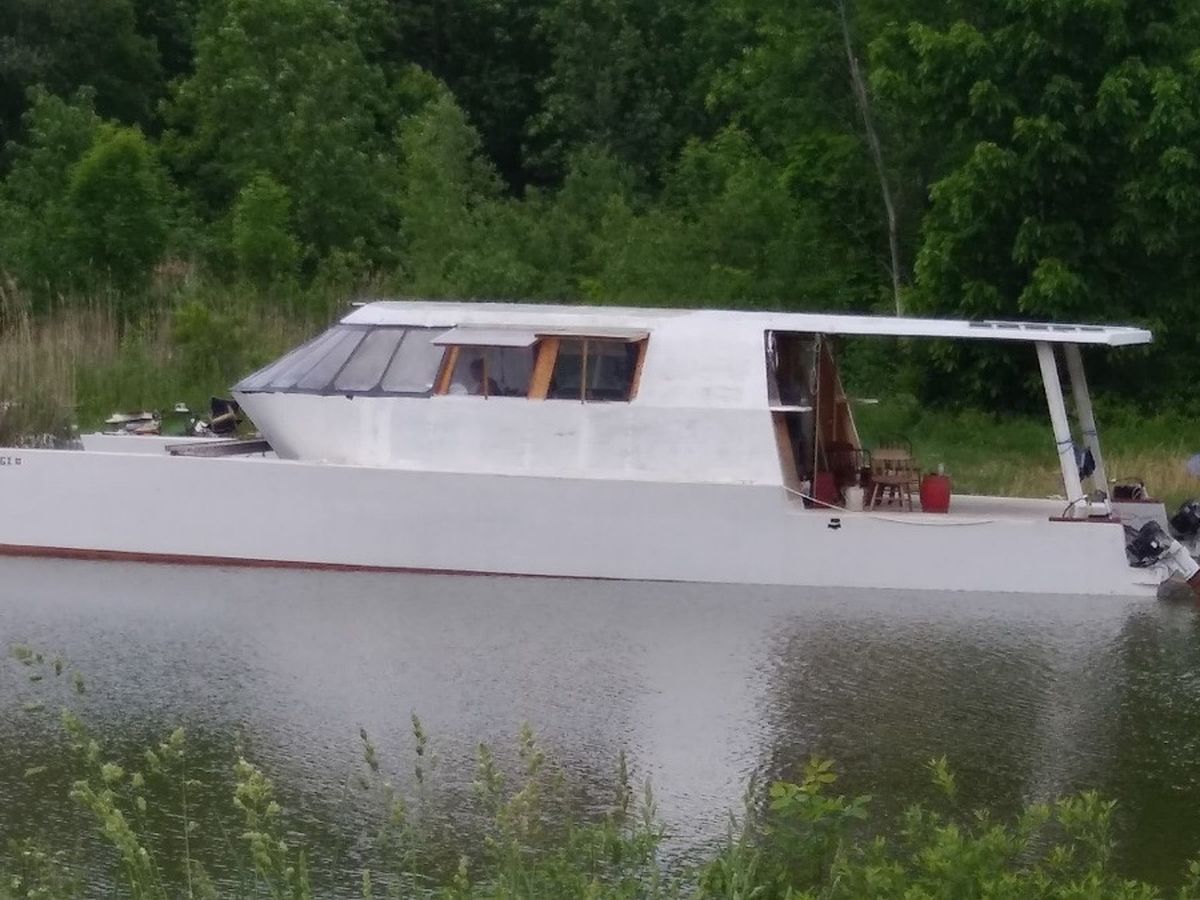 floating home was resting near the rocky shore, listing 45 degrees to port. The port hull would never rise again. The built-in foam and empty containers would keep her from