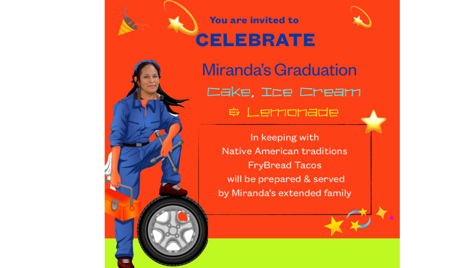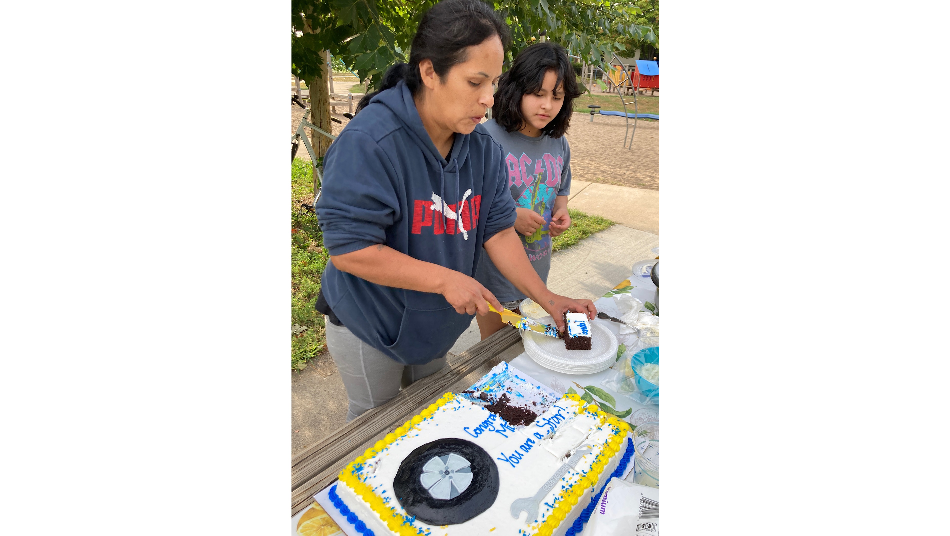 We celebrated Miranda's achievement with a cake decorated with a tire and a wrench. A cutout of a woman mechanic (with Miranda’s photo) was stuck into the center of the cake. It was, in Miranda’s memory, the first cake someone bought for her since she was 13 years old!